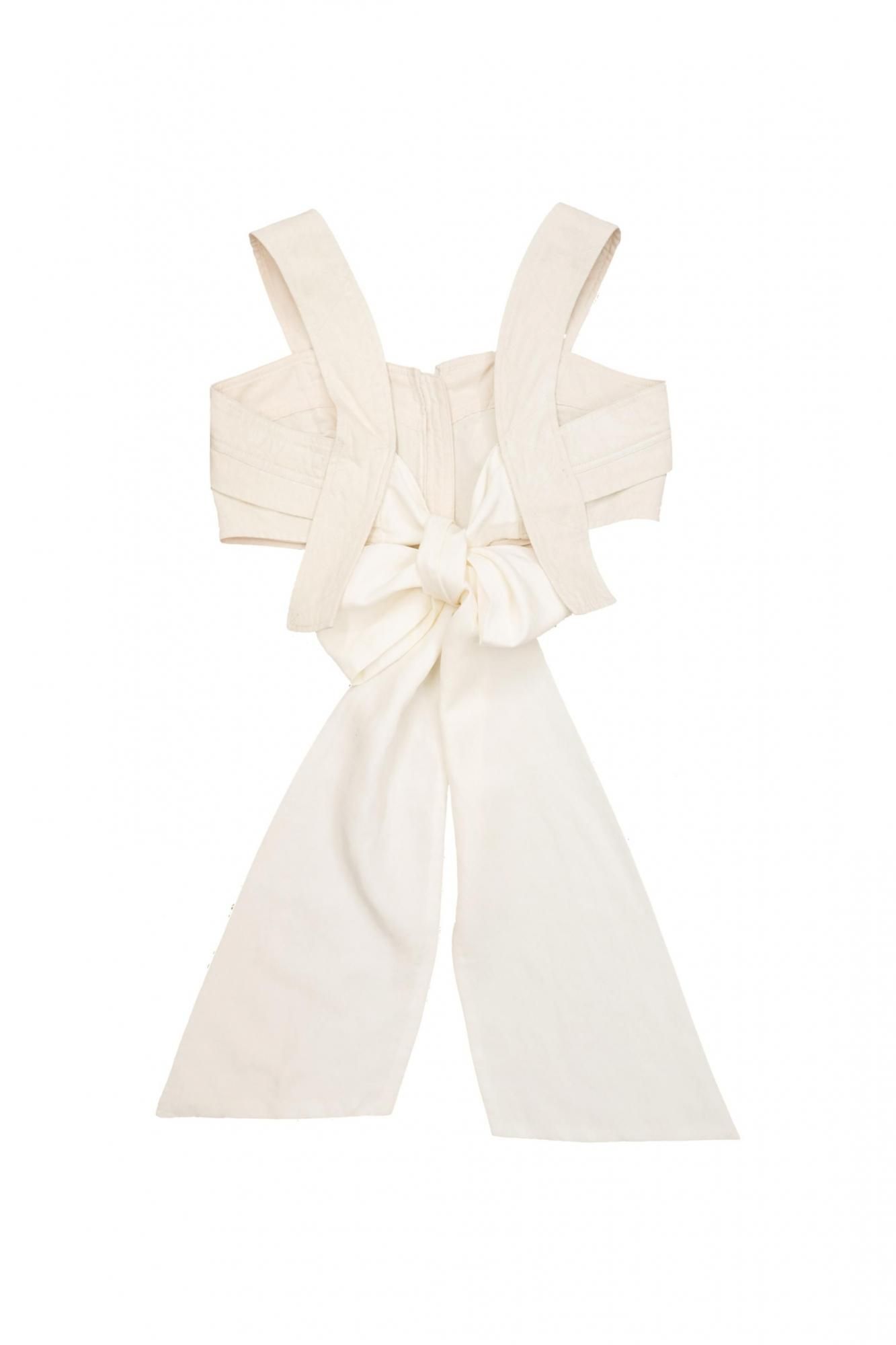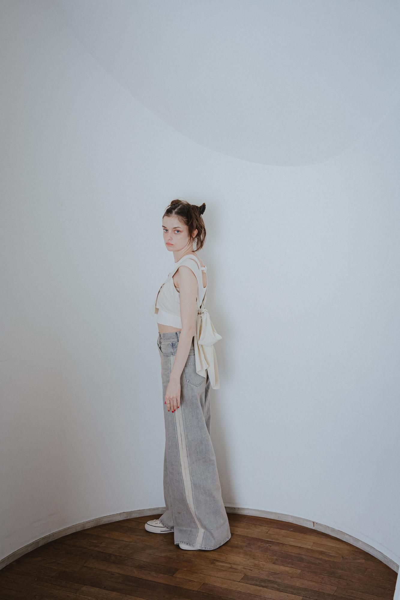 デニムにたたいたジップ、ジグザグステッチの無骨さと、ハートネックやバックリボンの可愛らしさを掛け合わせたデザインのビスチェ。