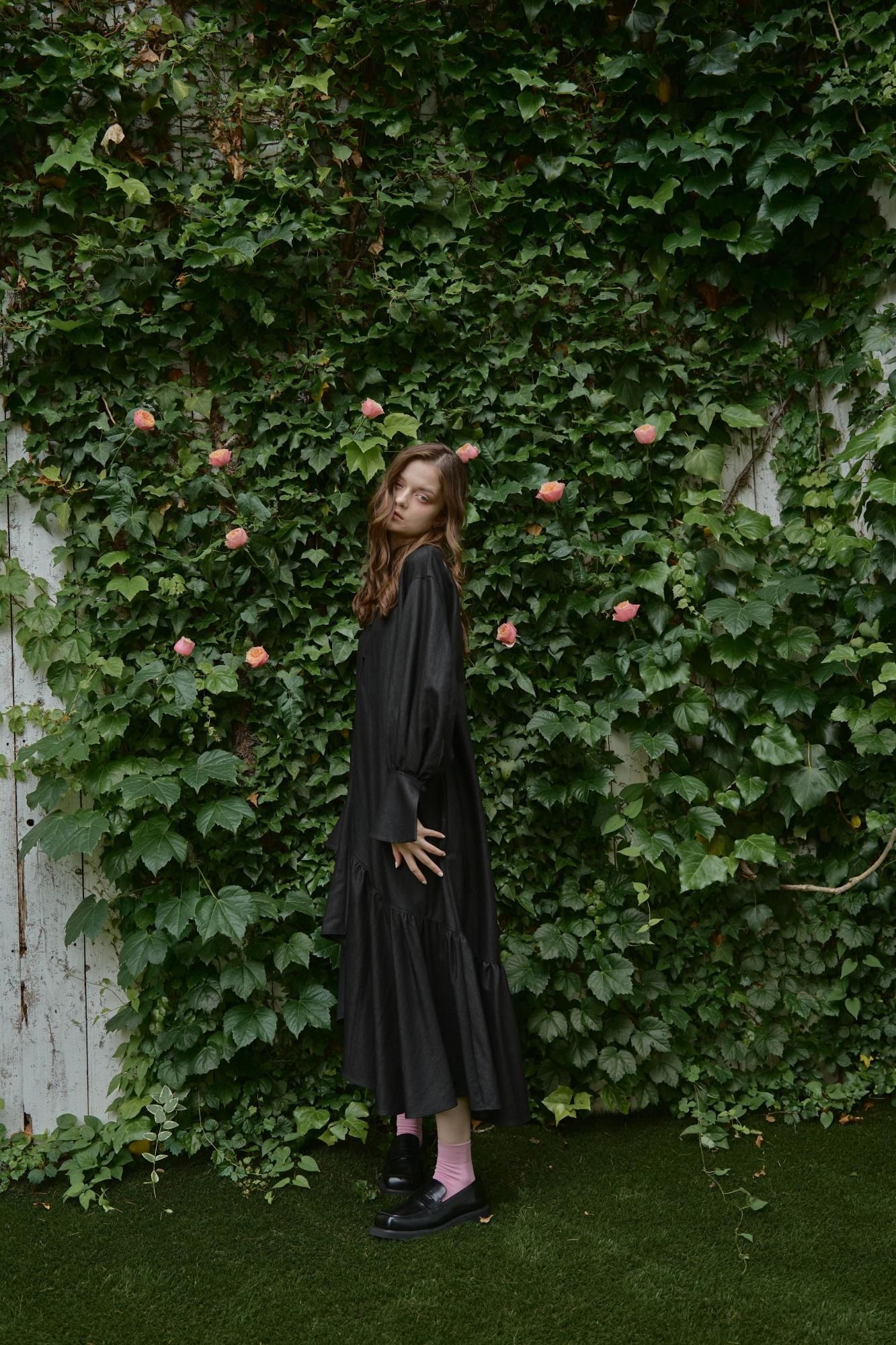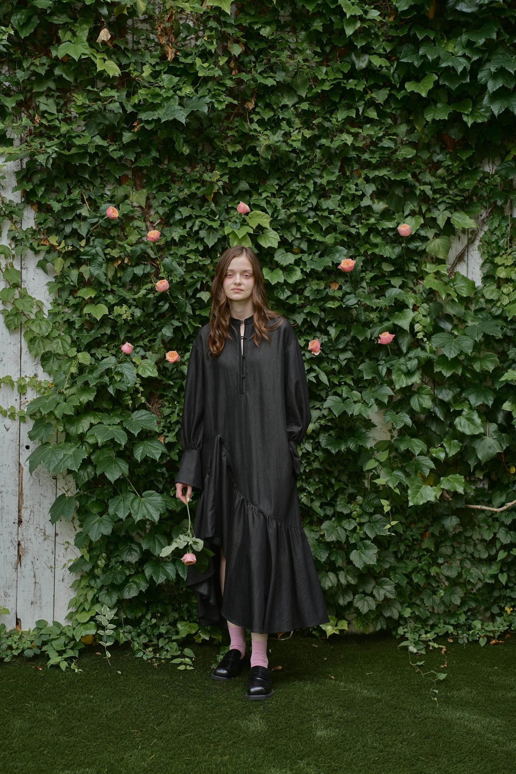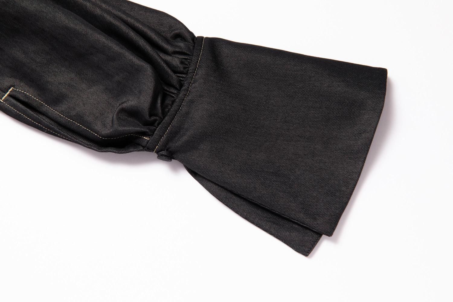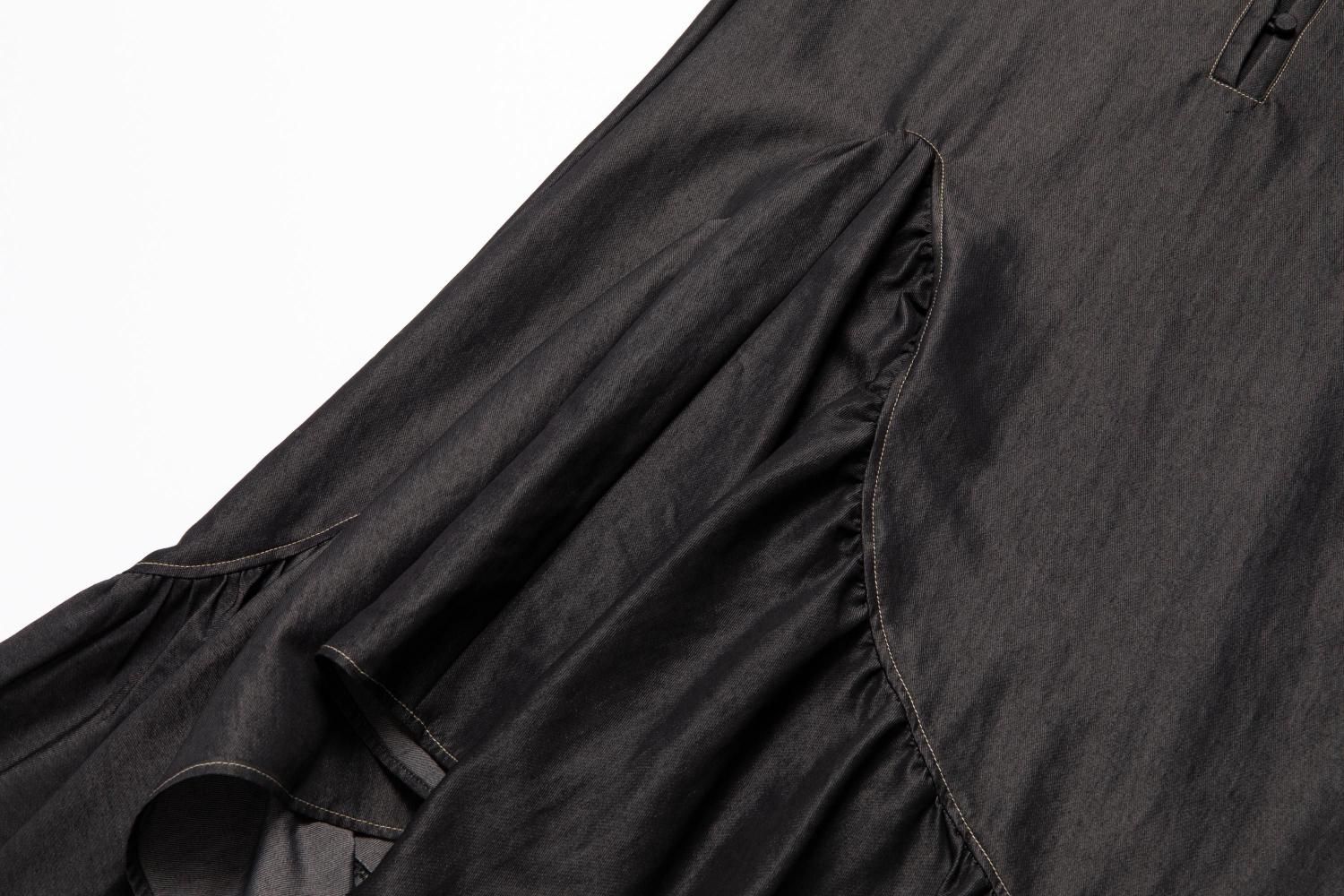 アシンメトリーなギャザーフレアで、右前は膝上あたりまで脚を見せられるデザイン。