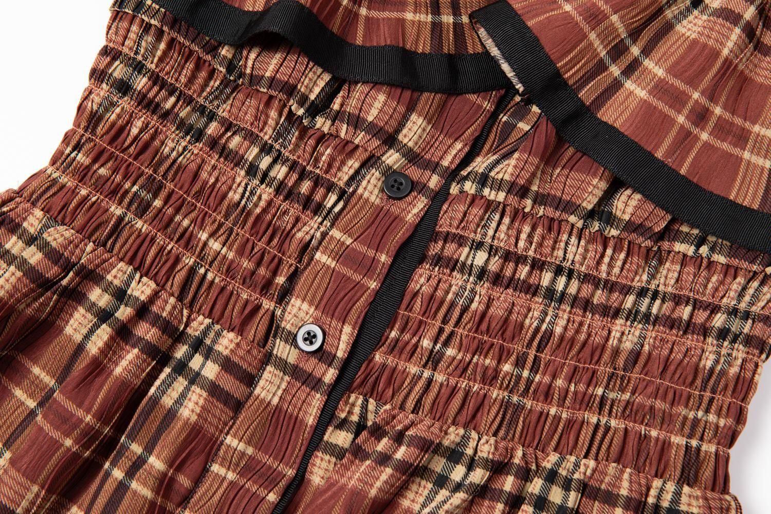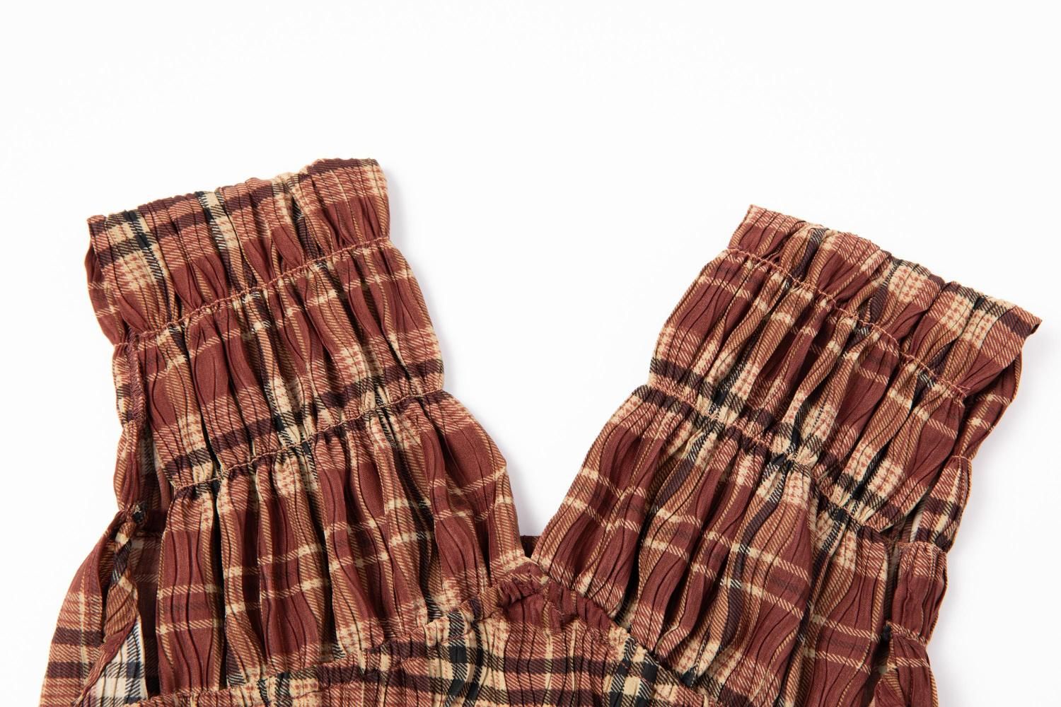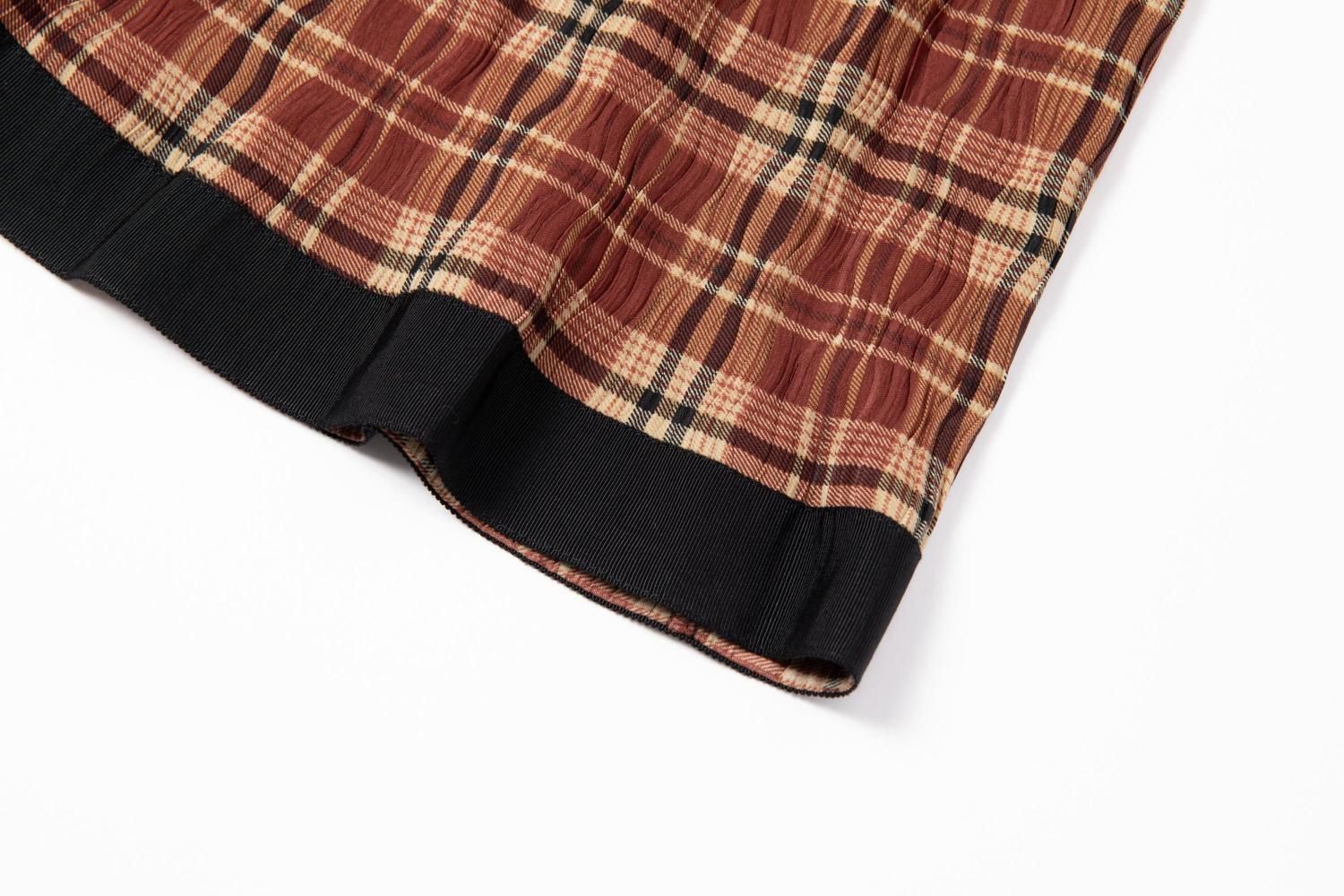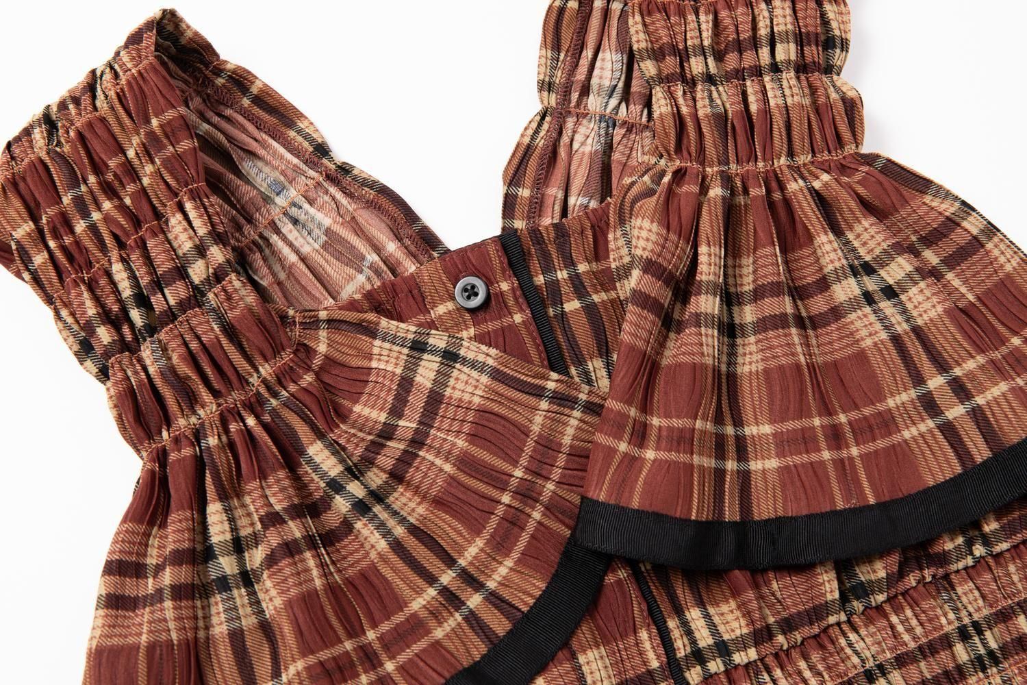 秋らしいカラーリングのチェック柄がかわいいプリーツ素材のワンピース。