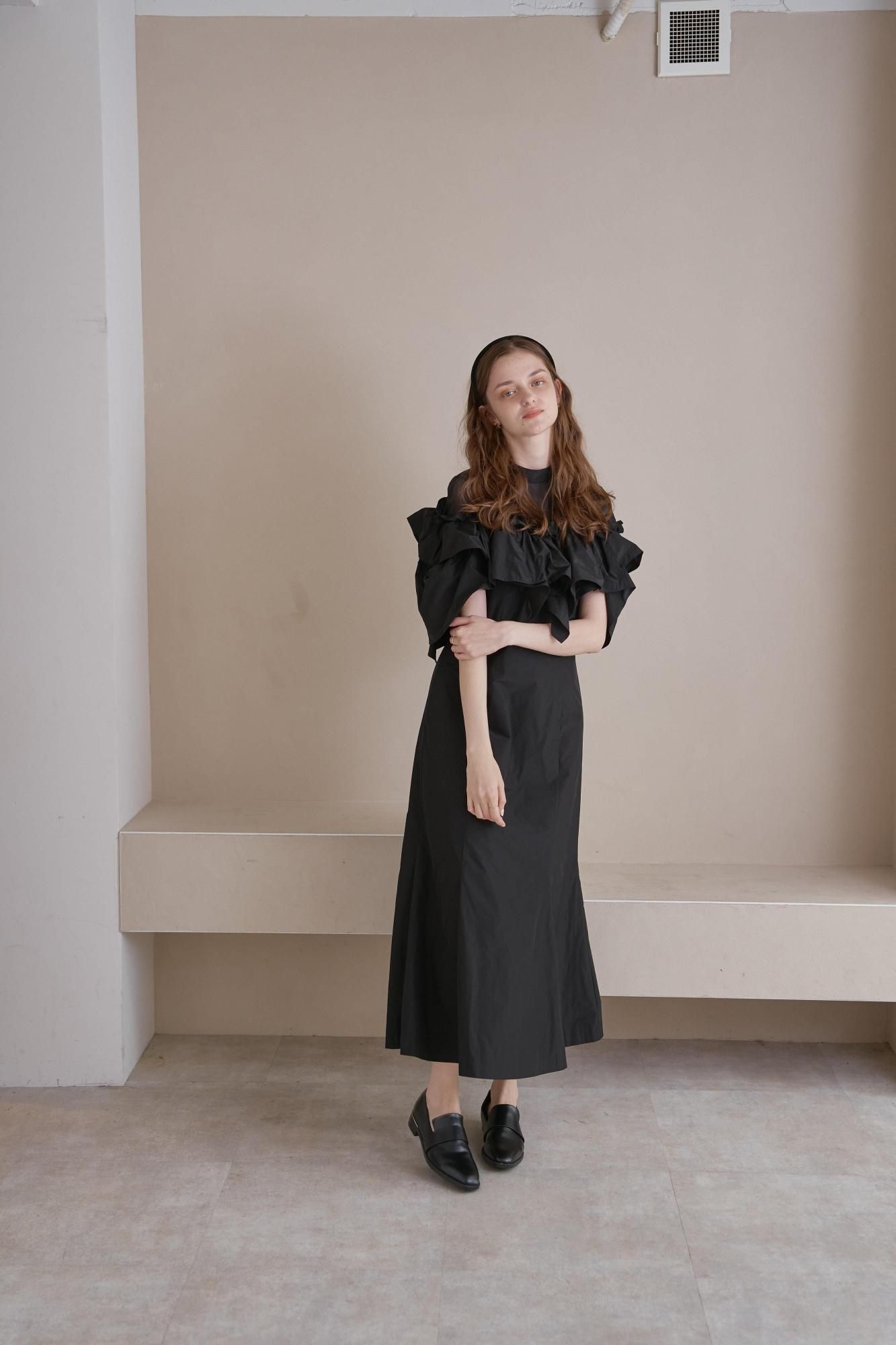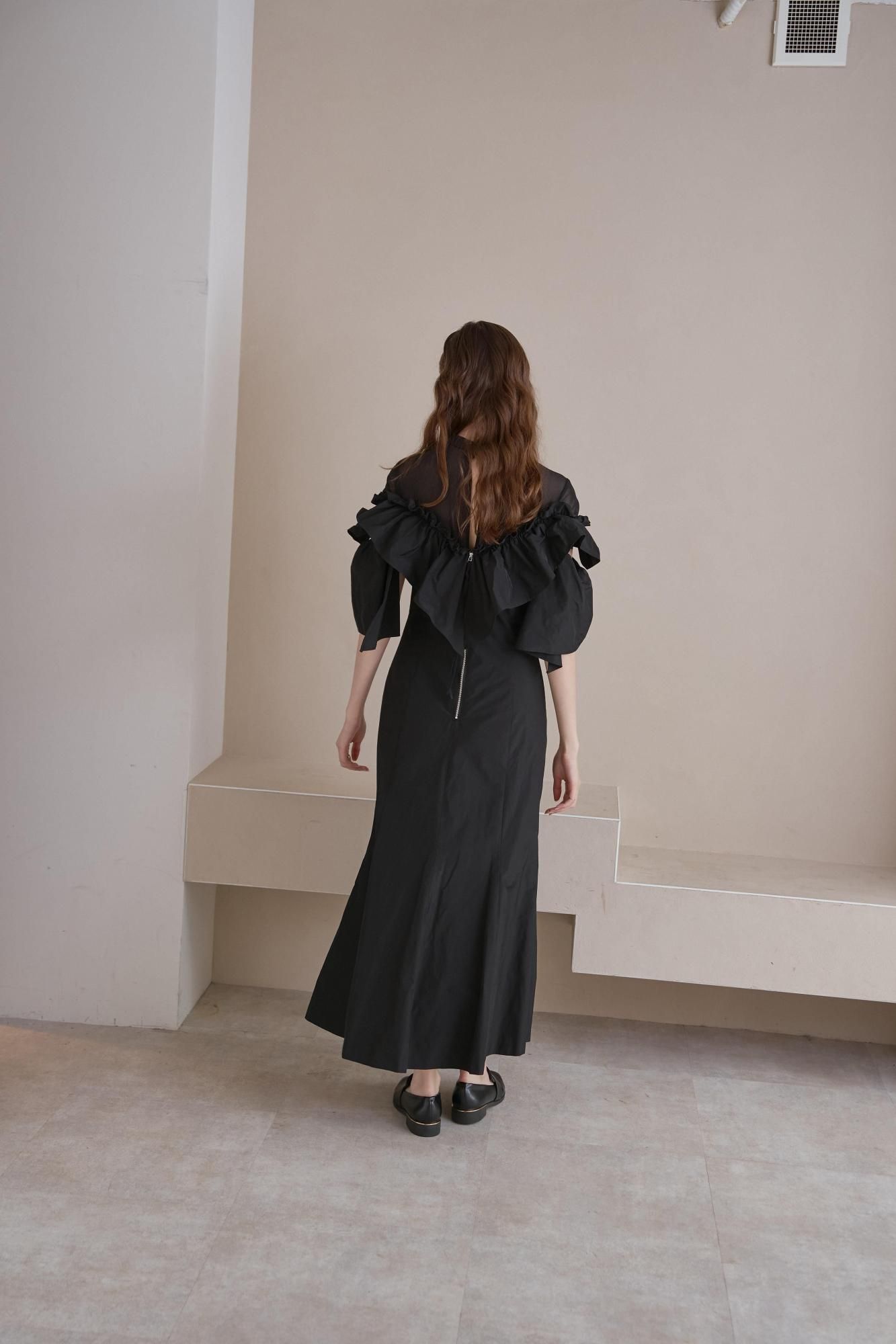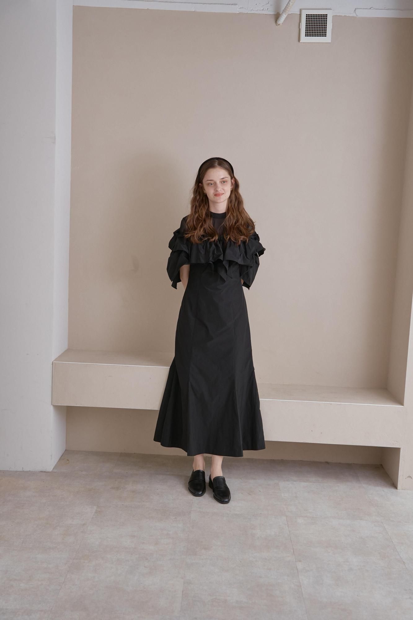 胸元から袖にかけてアシンメトリーなギャザーフリルをあしらったドレス。