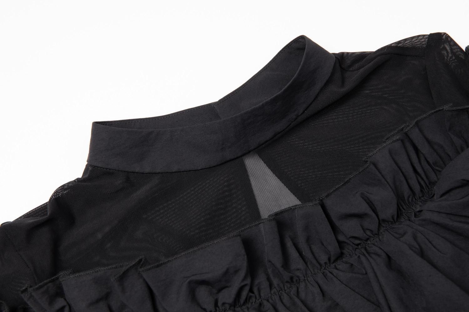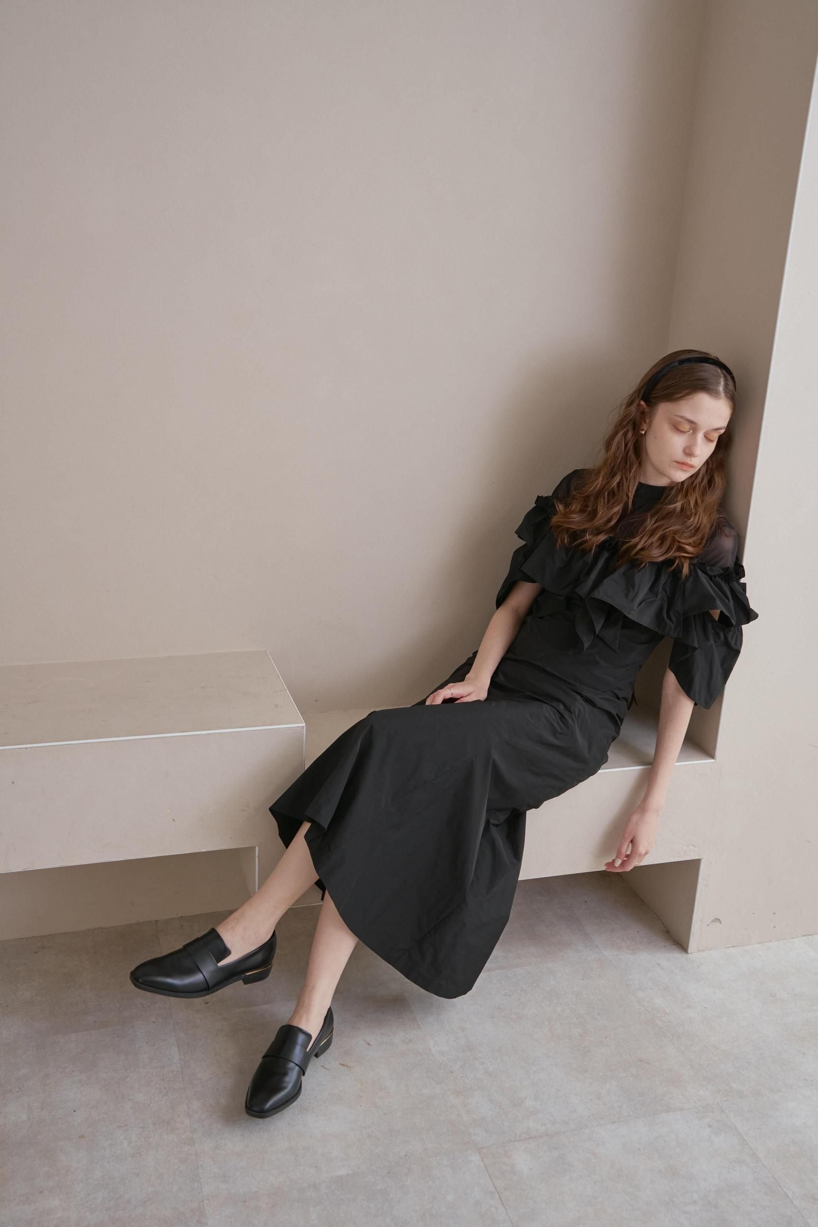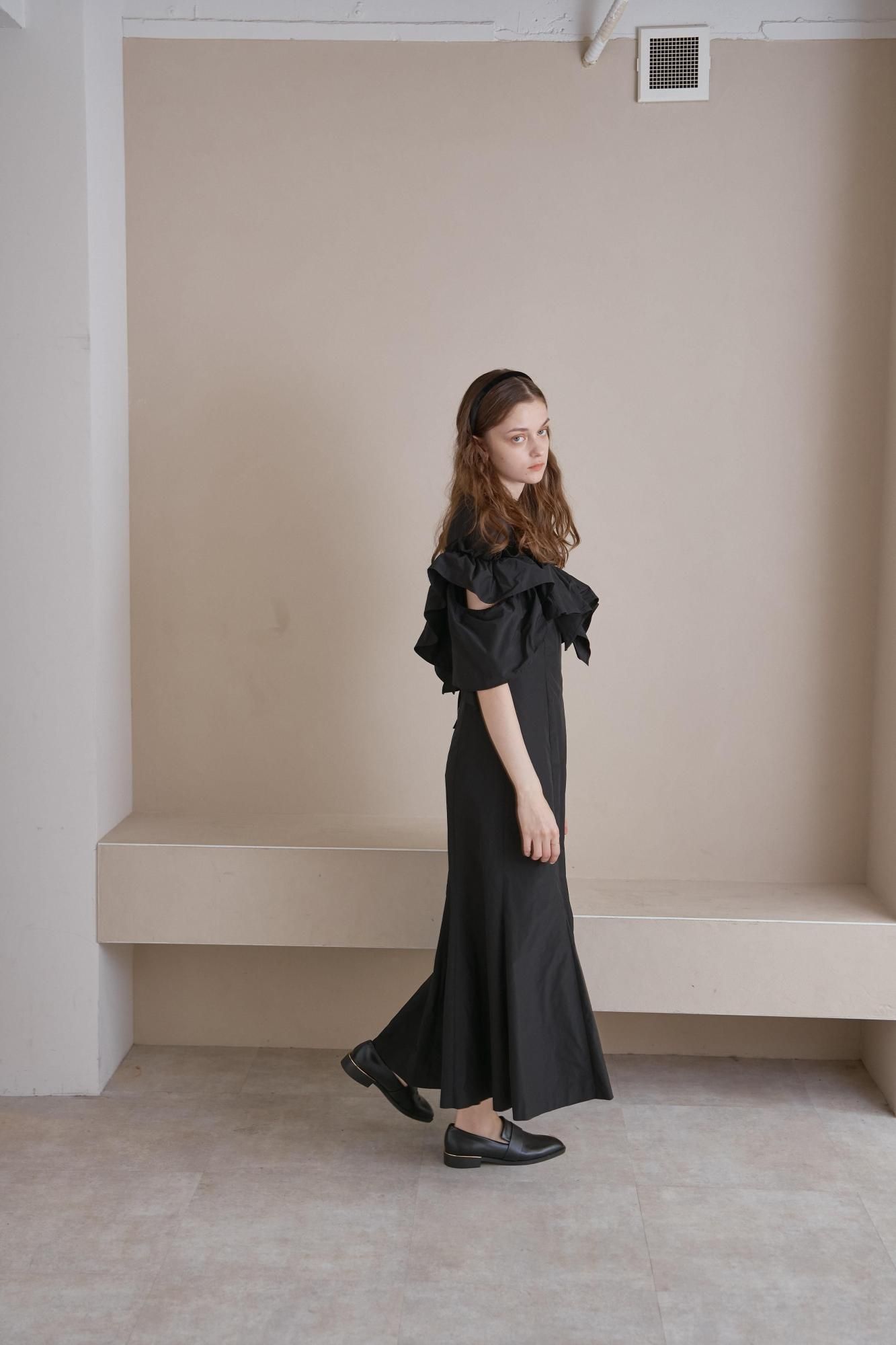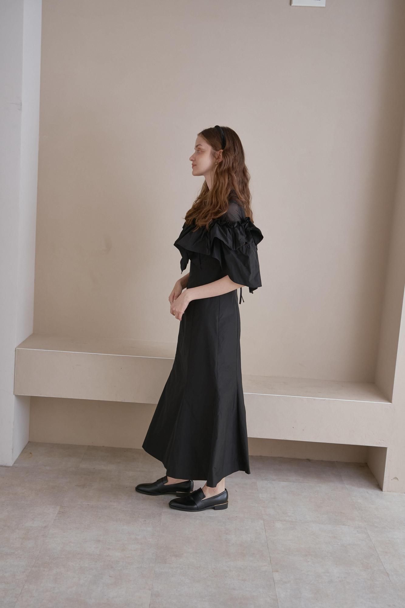 胸元から袖にかけてアシンメトリーなギャザーフリルをあしらったドレス。