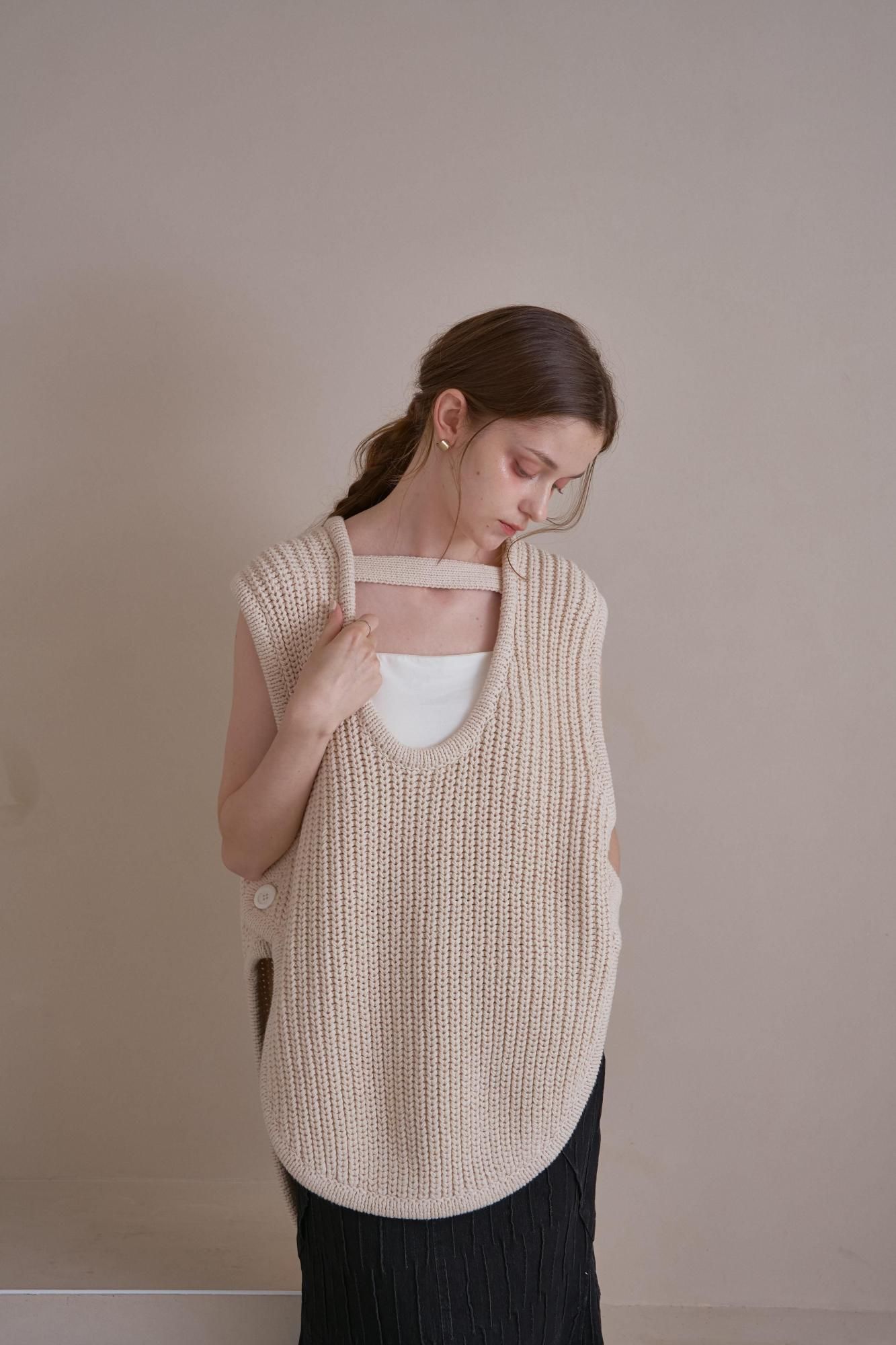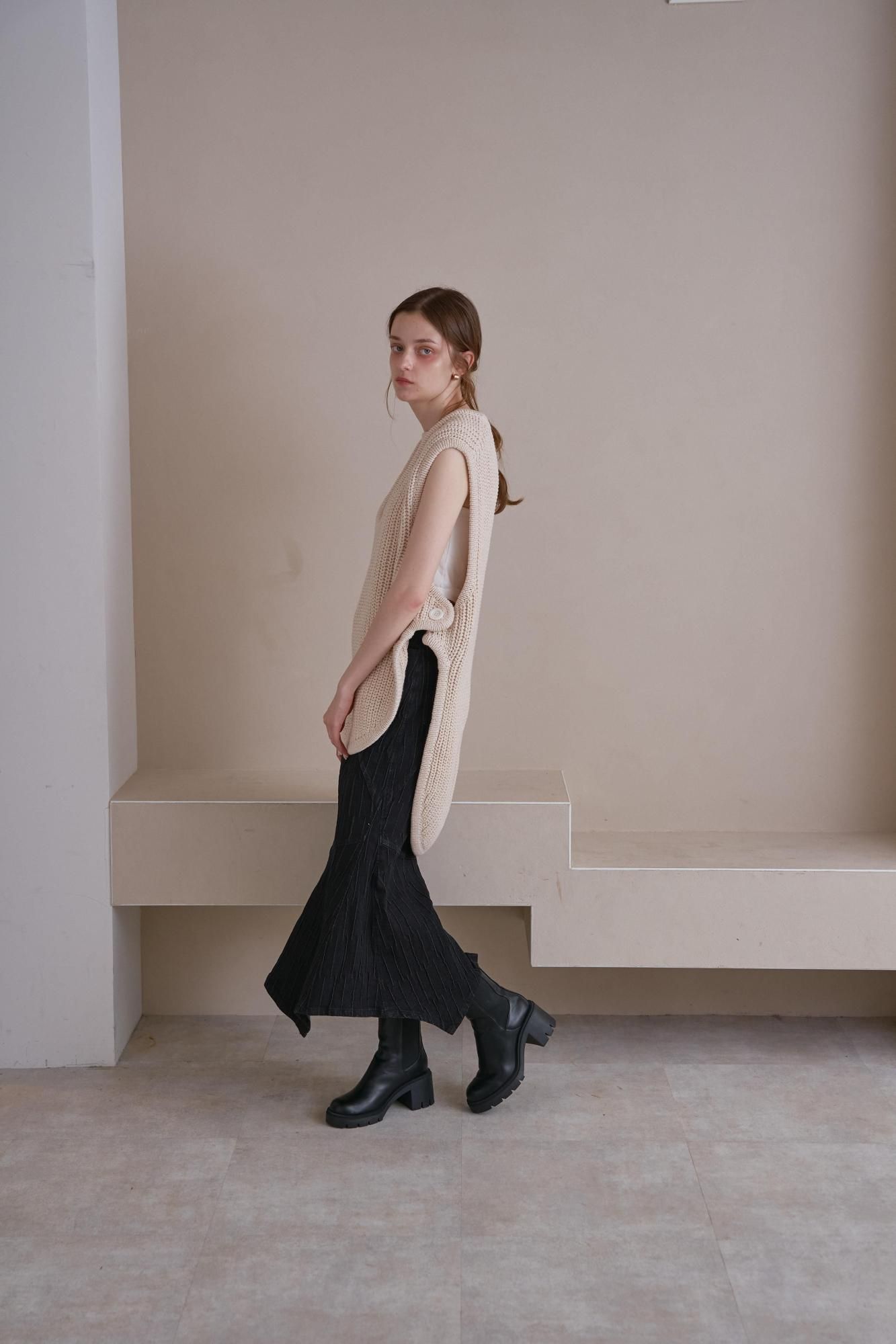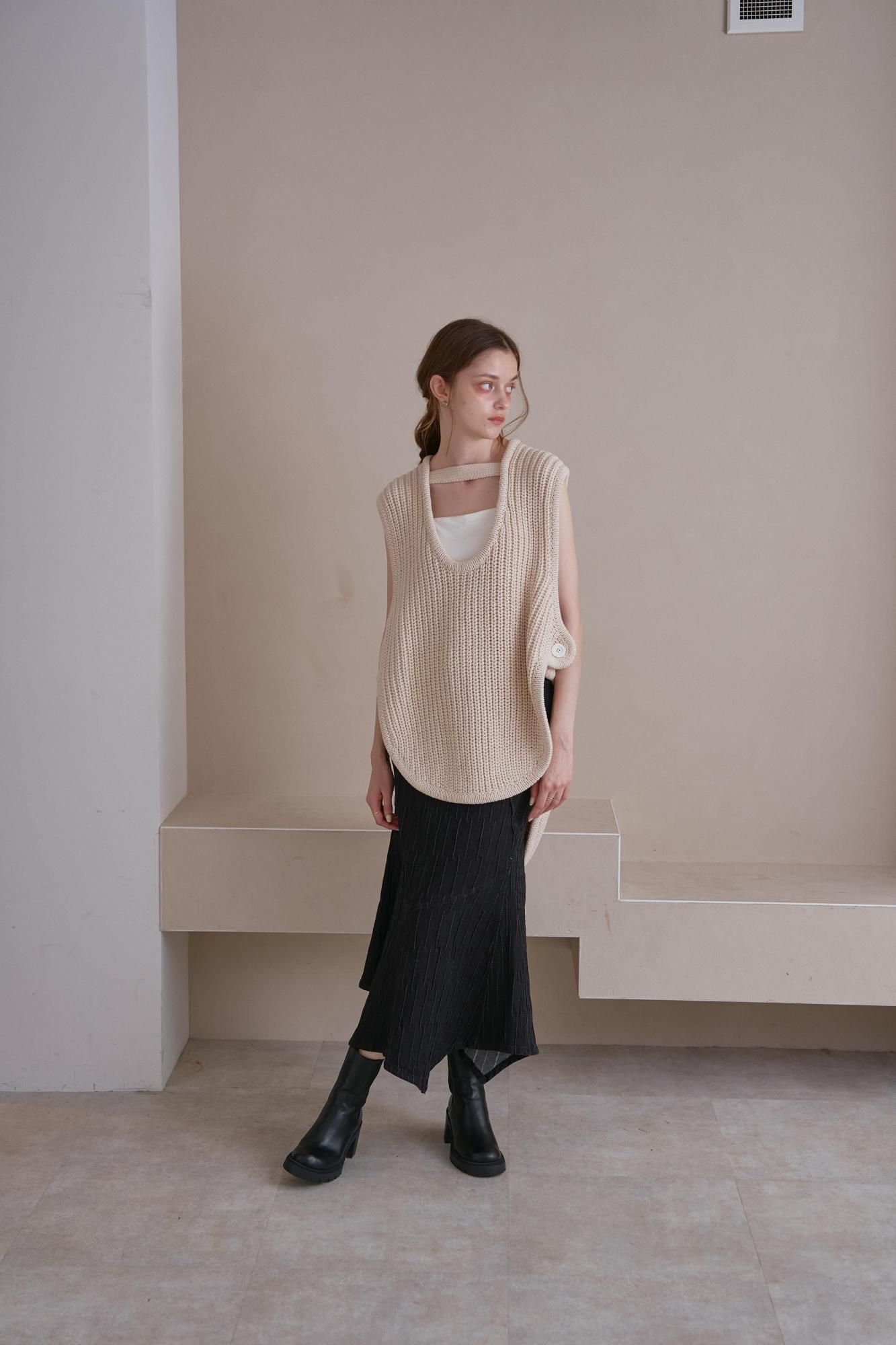 前後差をつけたラウンドヘムに、サイドはざっくり開けてタブで留める抜け感のあるデザイン。