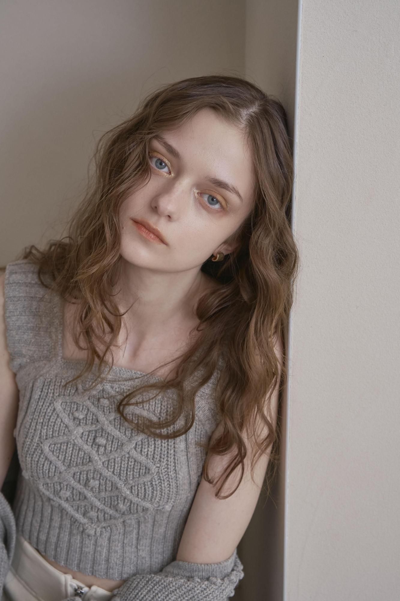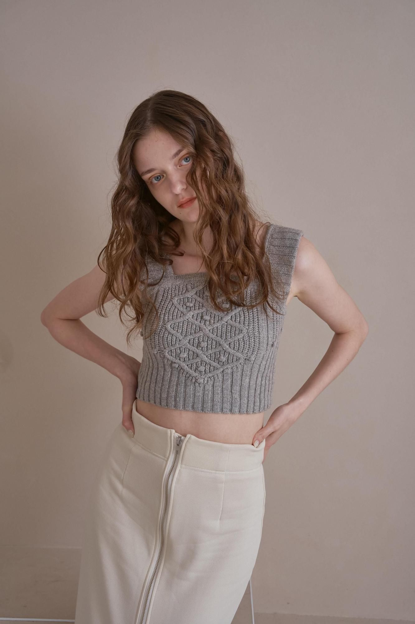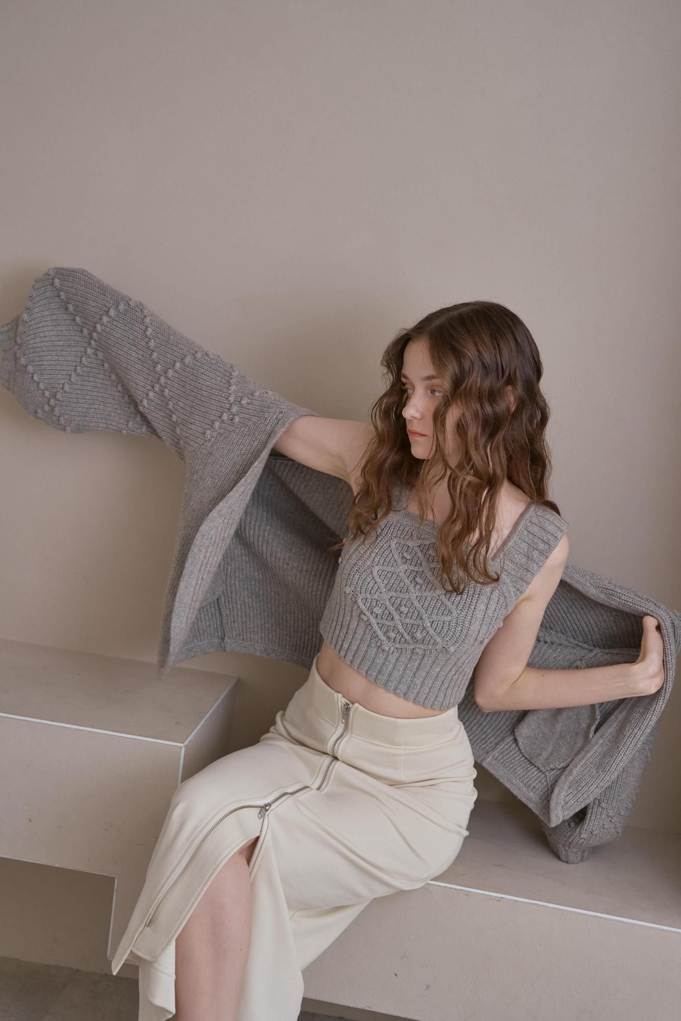 クロップド丈のニットタンクとオーバーサイズのカーディガンのバランスがポイントです。