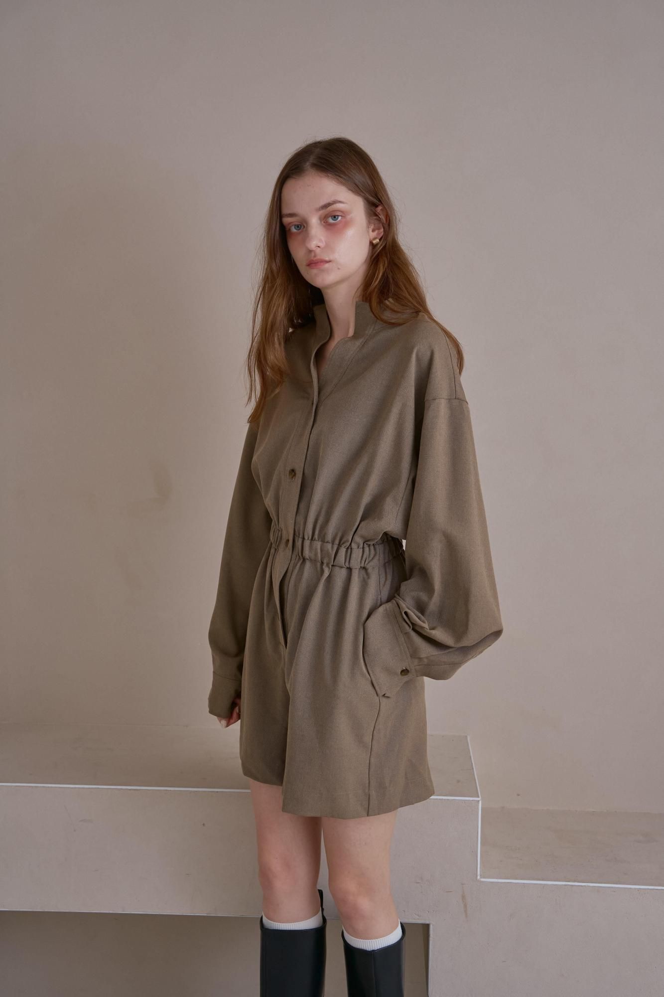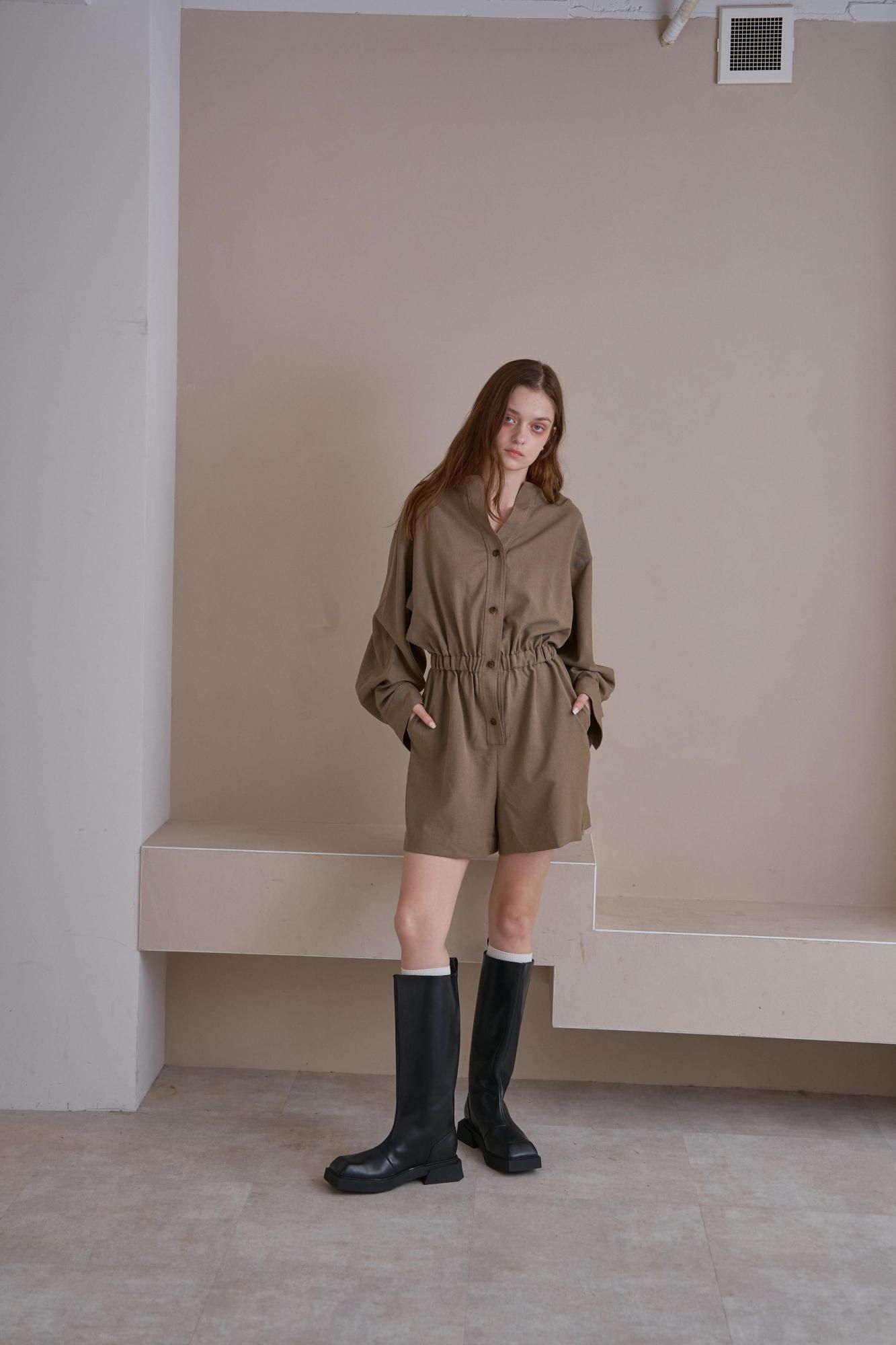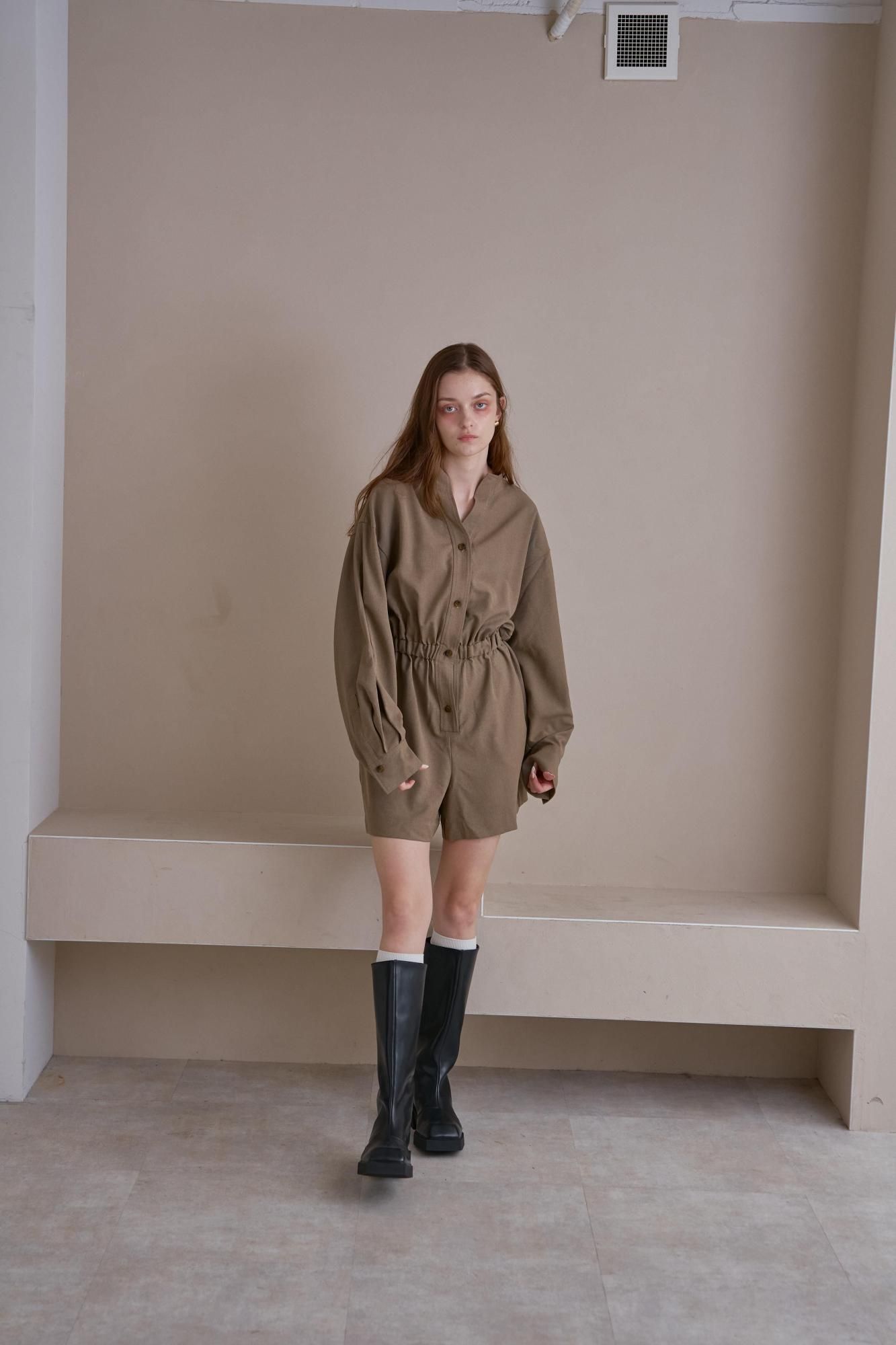スタンドカラーにVあきの前立てを付けたシャツオールインワン。