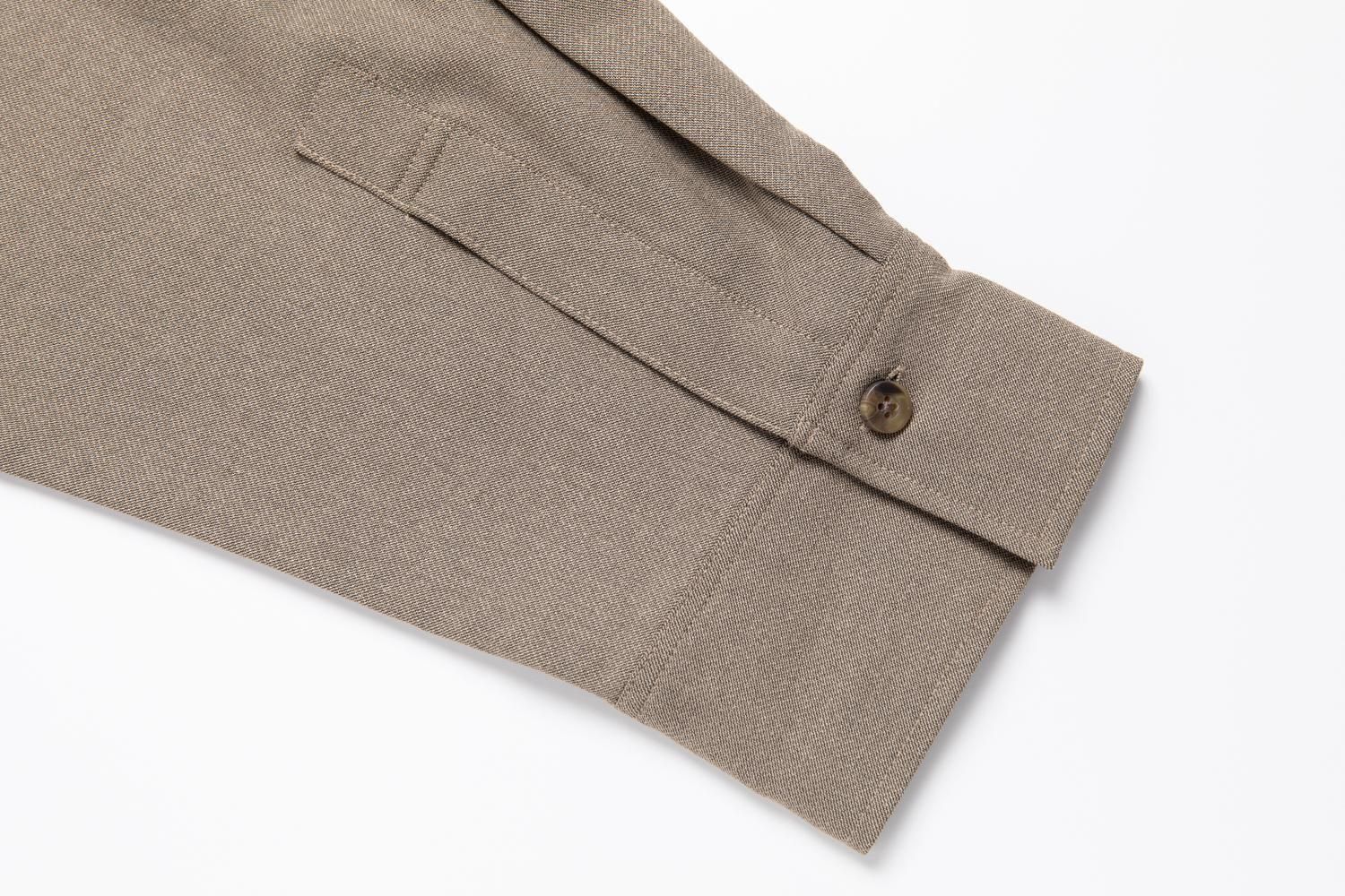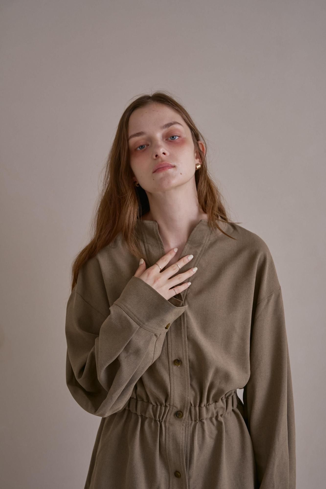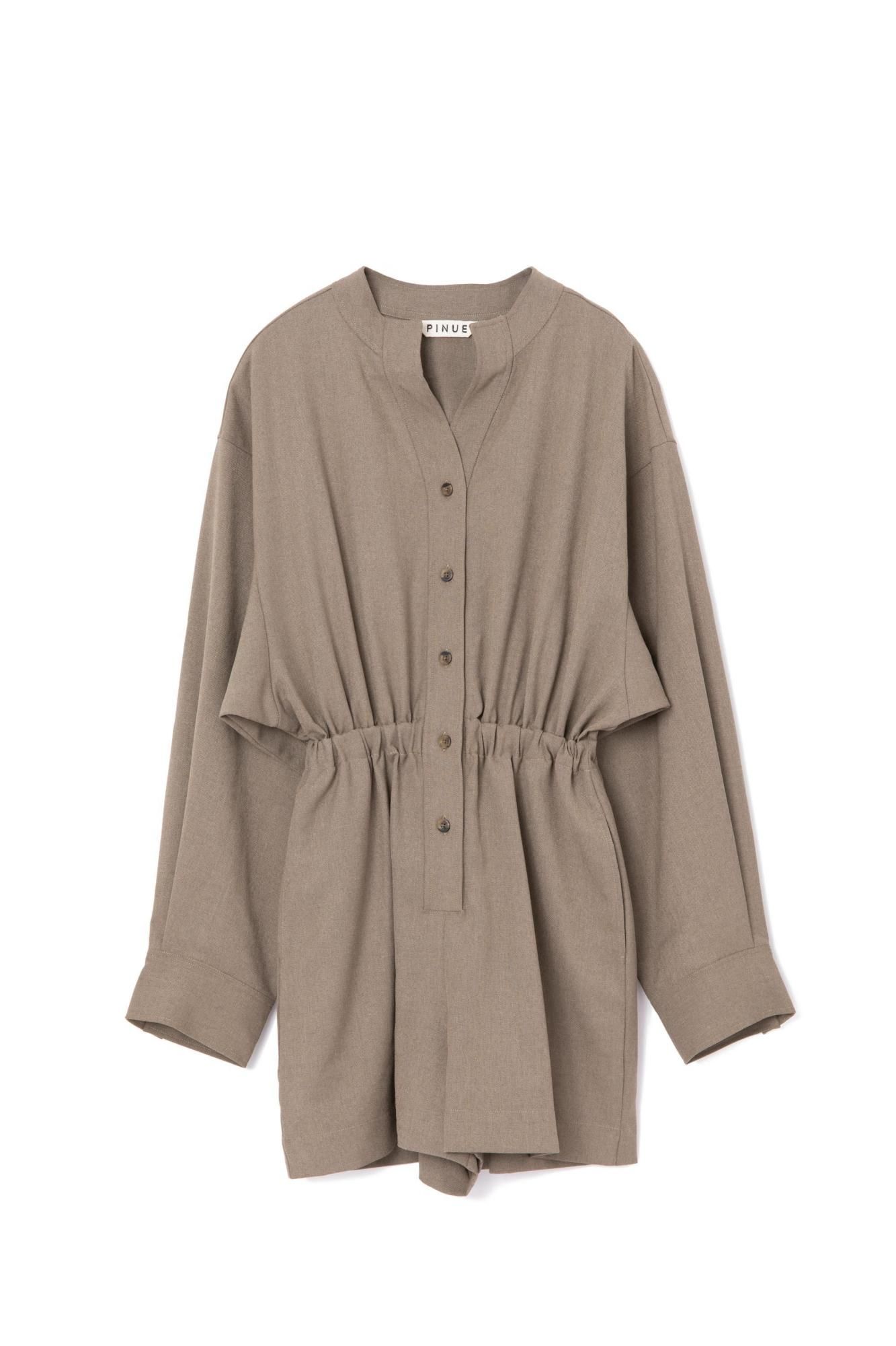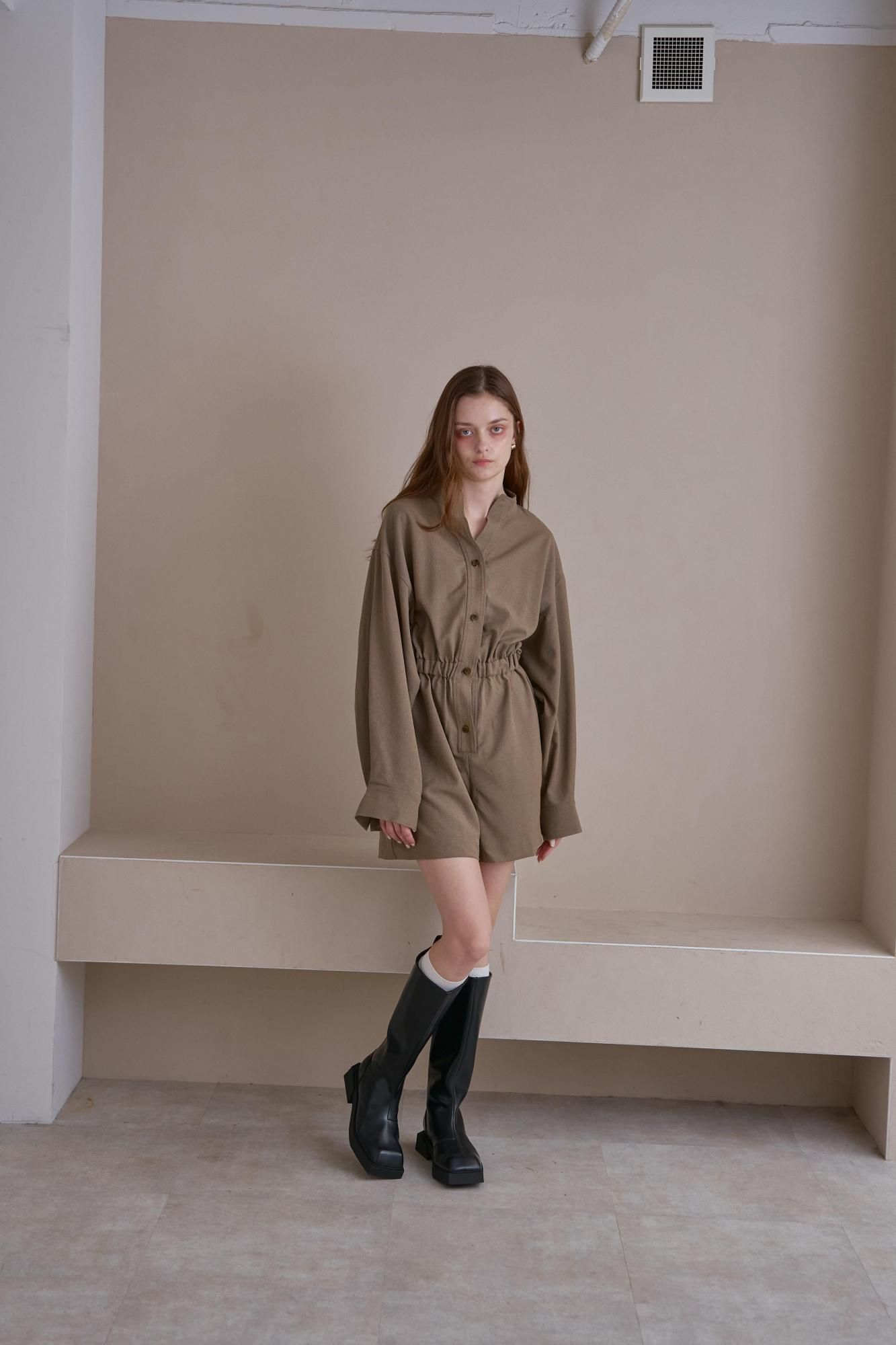 スタンドカラーにVあきの前立てを付けたシャツオールインワン。