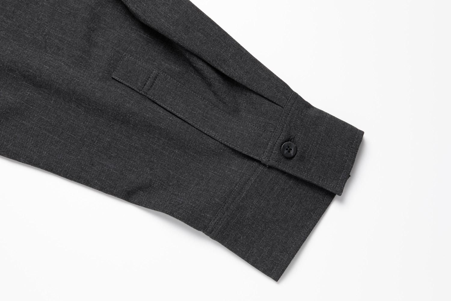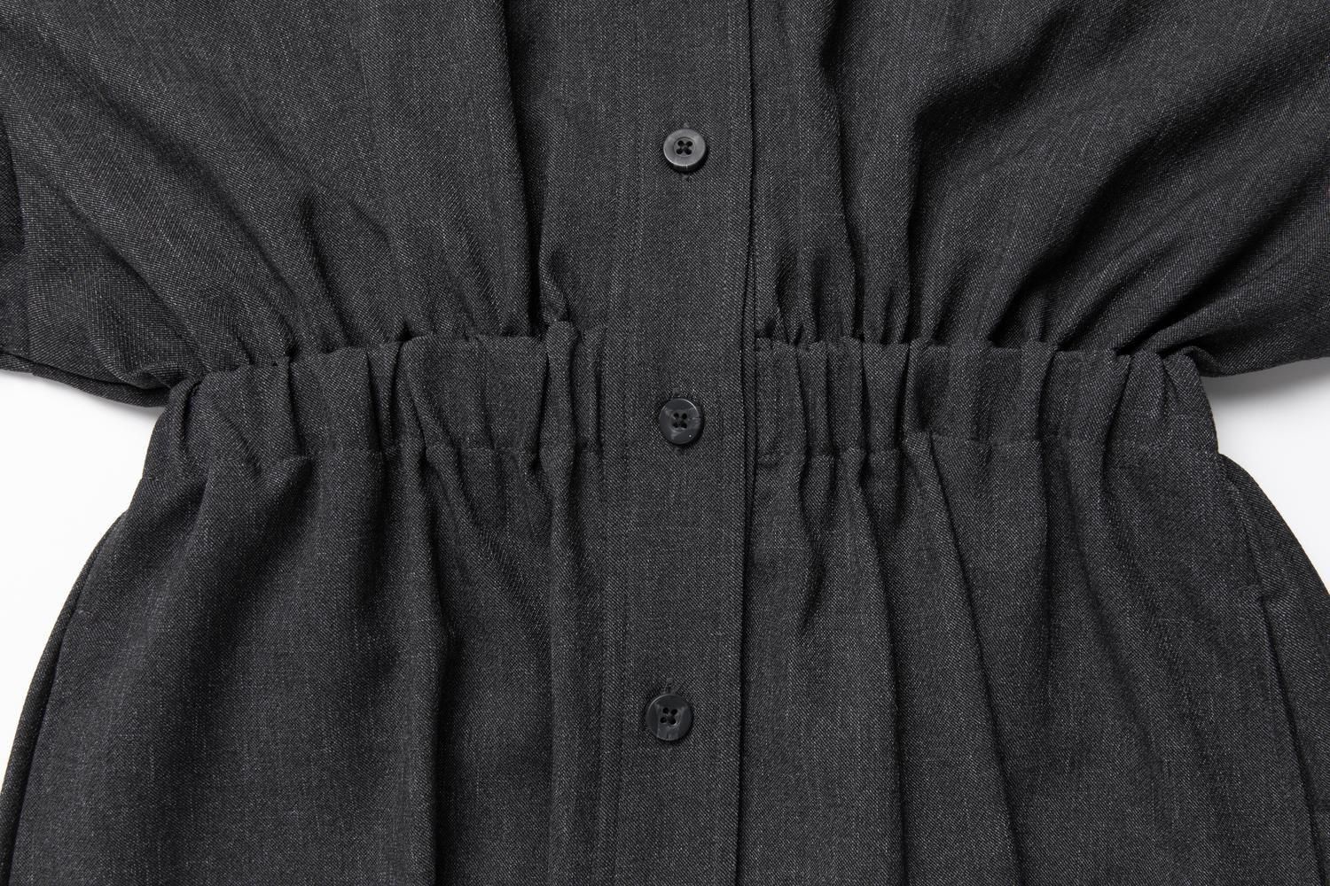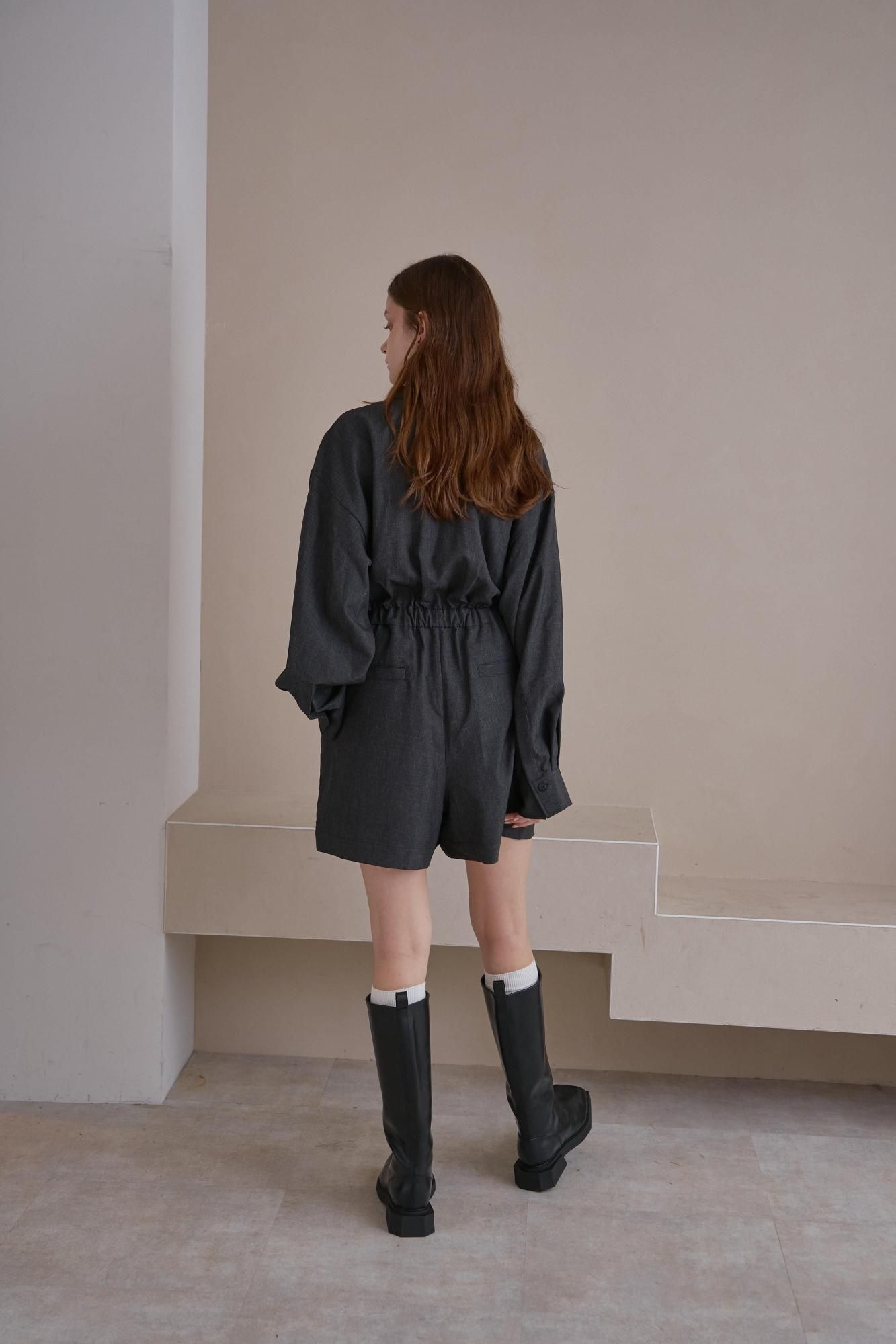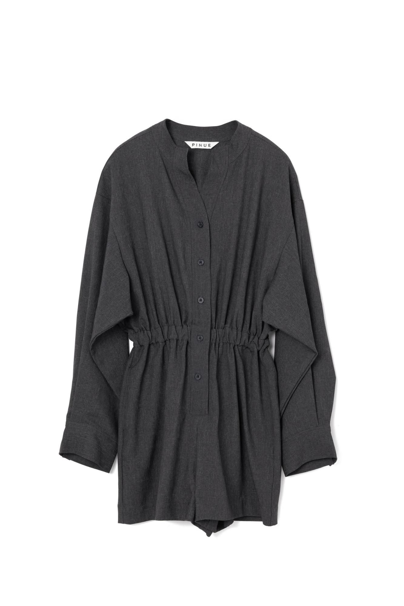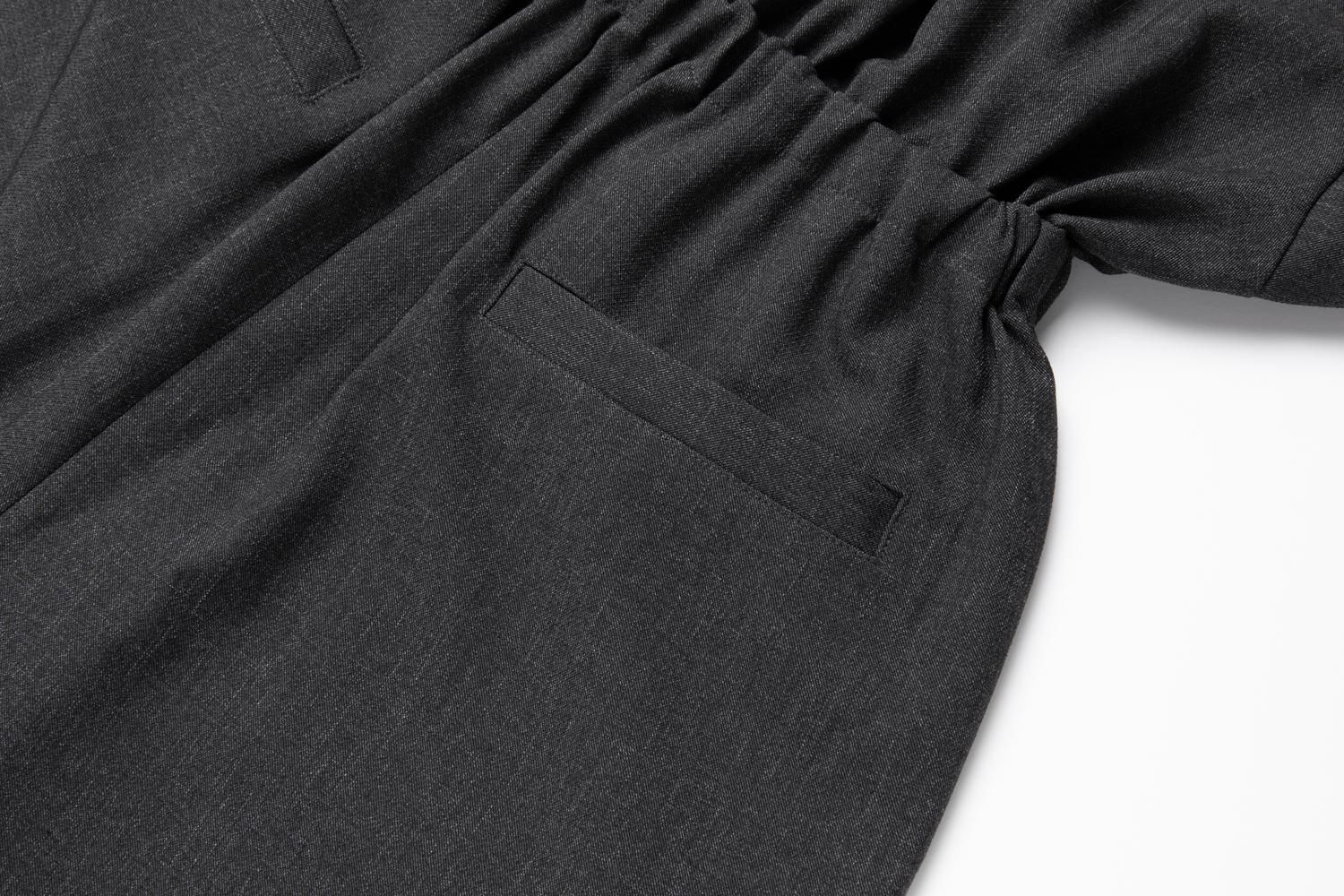 スタンドカラーにVあきの前立てを付けたシャツオールインワン。