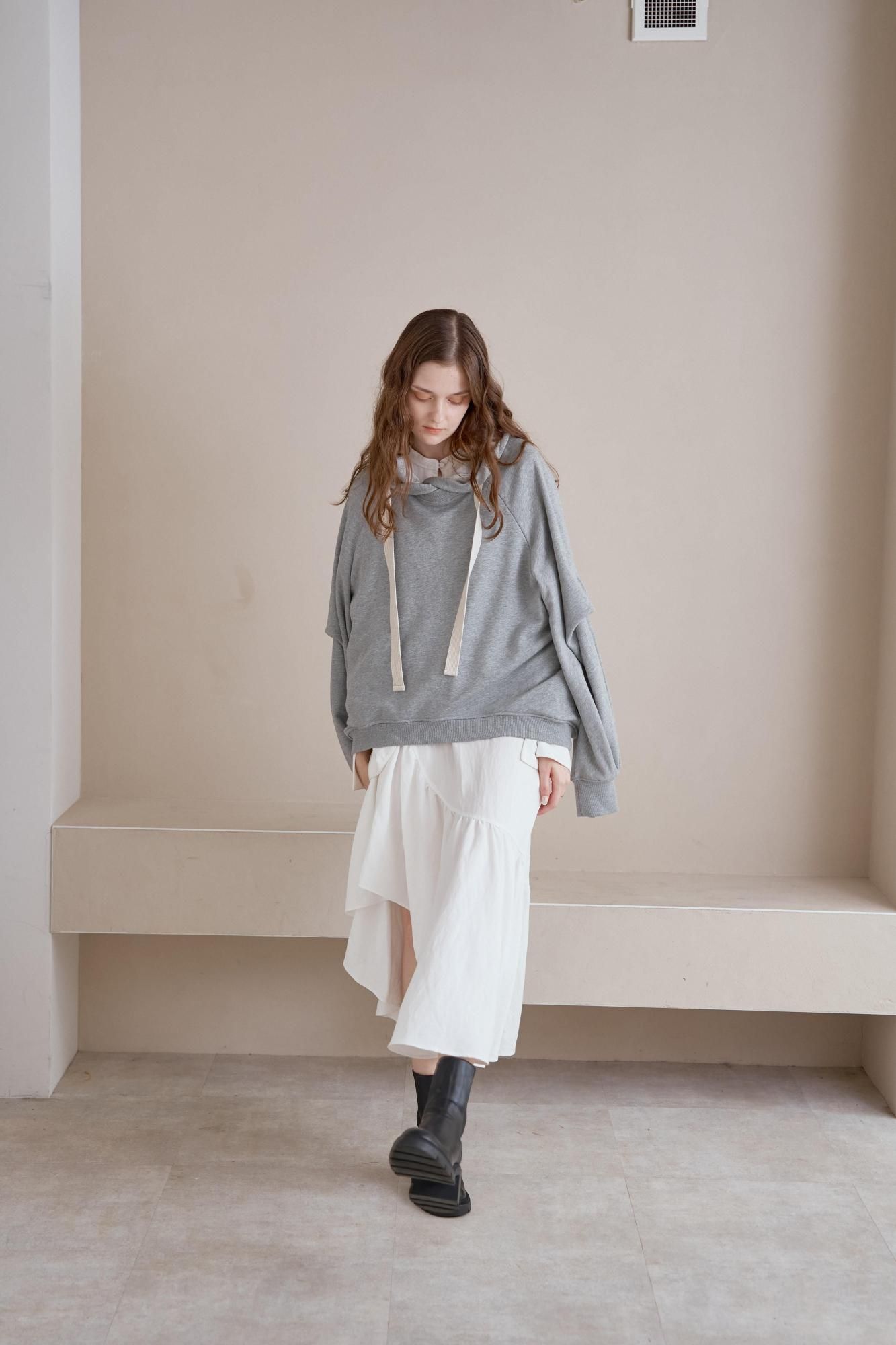 タックをとったボリューミーな袖が特徴的な裏毛パーカー。