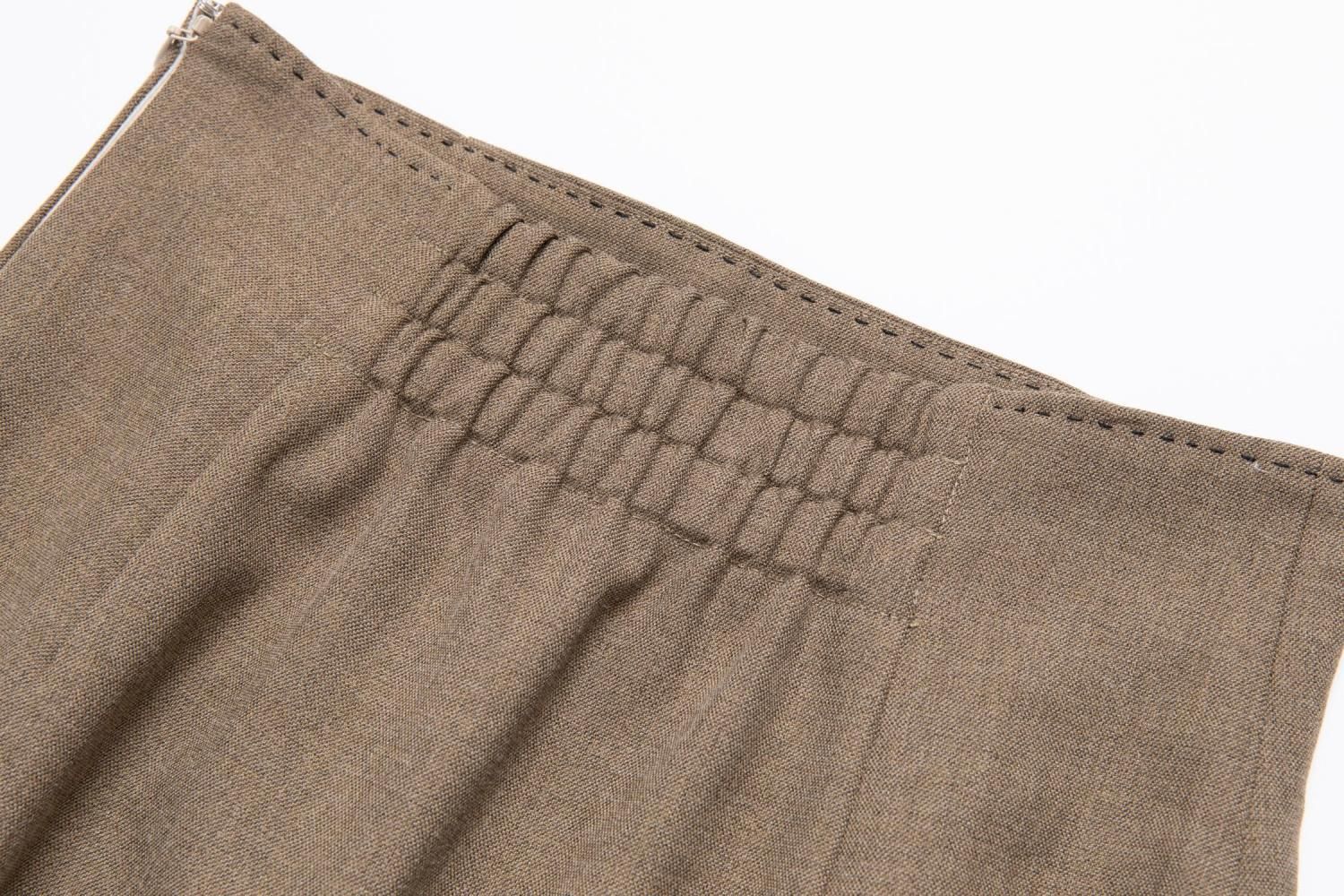 メランジ調の生地にバイカラーのステッチがアクセントになったセットアップ。