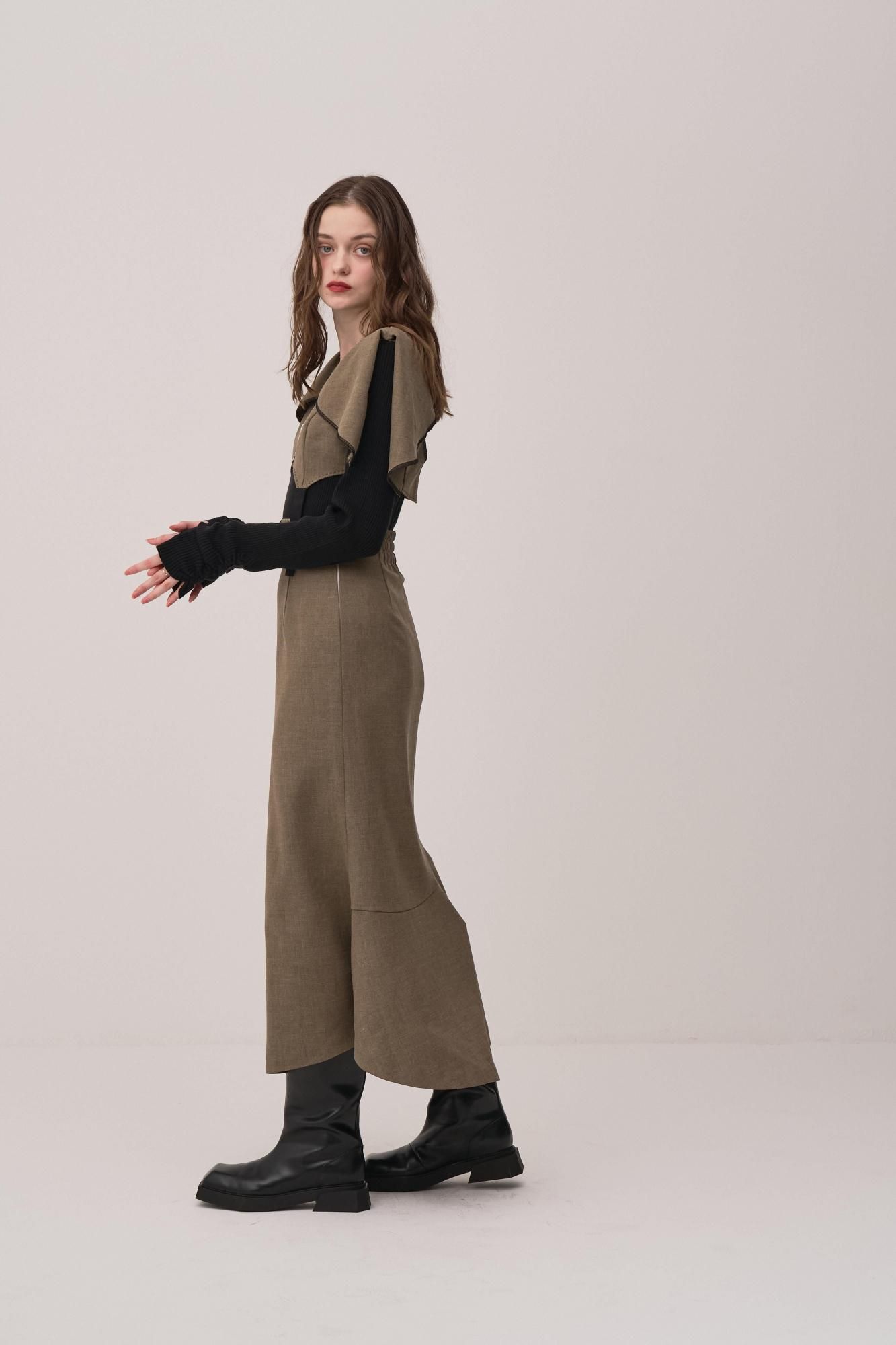 肩のタックフレアが目を惹くトップスはコンパクトな丈感にジップやテープ使いが効いたデザインに。スカートはアシンメトリーなマーメイドシルエットで単体でも着回しの効く1枚です。
