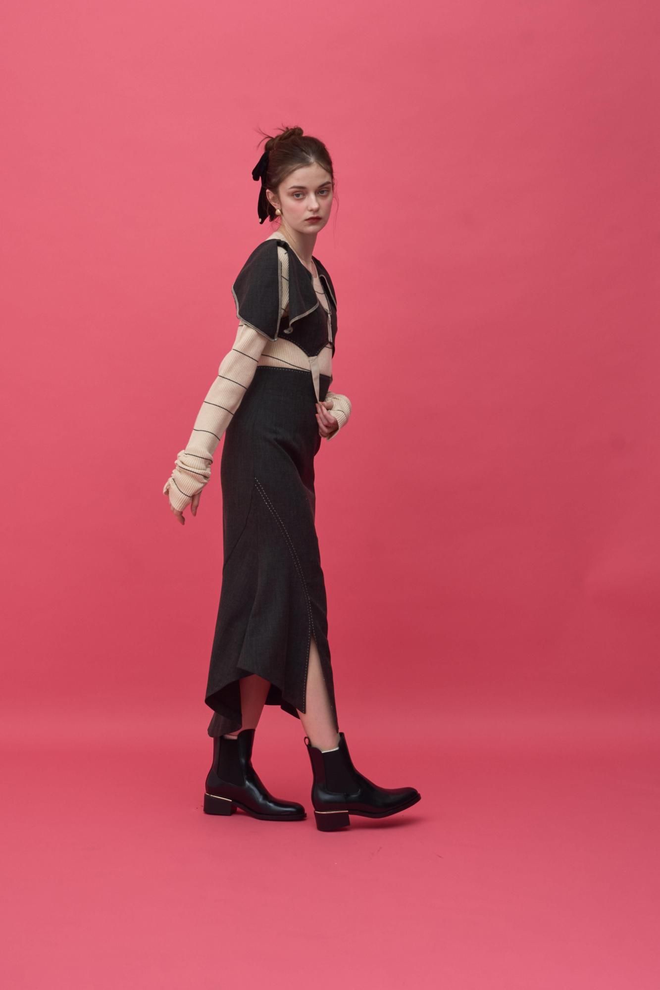 肩のタックフレアが目を惹くトップスはコンパクトな丈感にジップやテープ使いが効いたデザインに。スカートはアシンメトリーなマーメイドシルエットで単体でも着回しの効く1枚です。