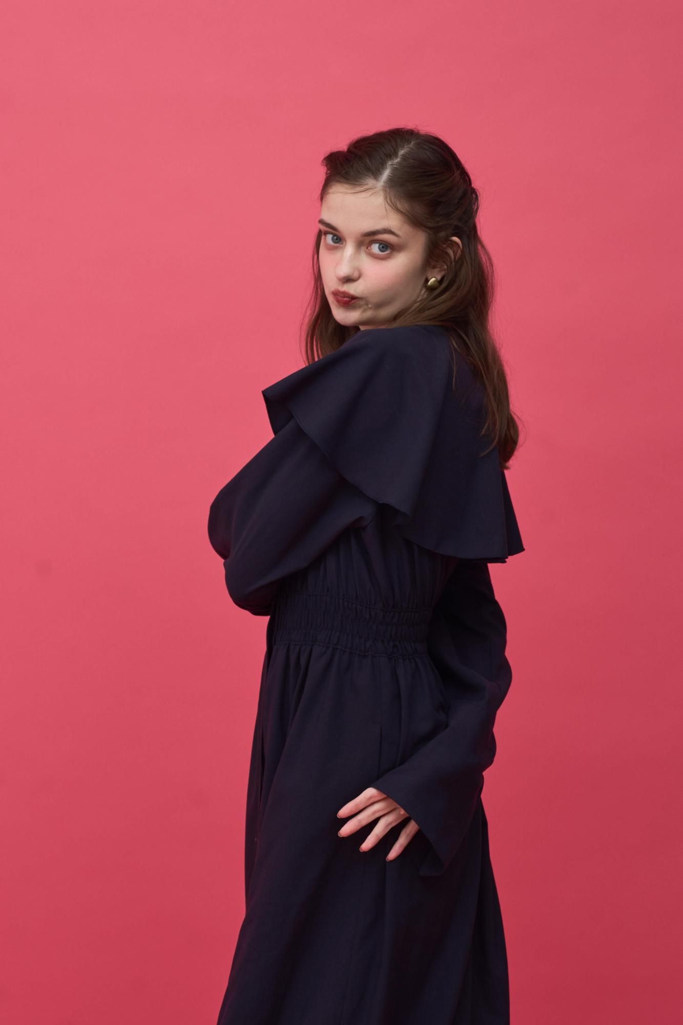 ケープカラーにシャーリングで絞ったウエスト、セミフレアのシルエットで女性らしく仕上げました。