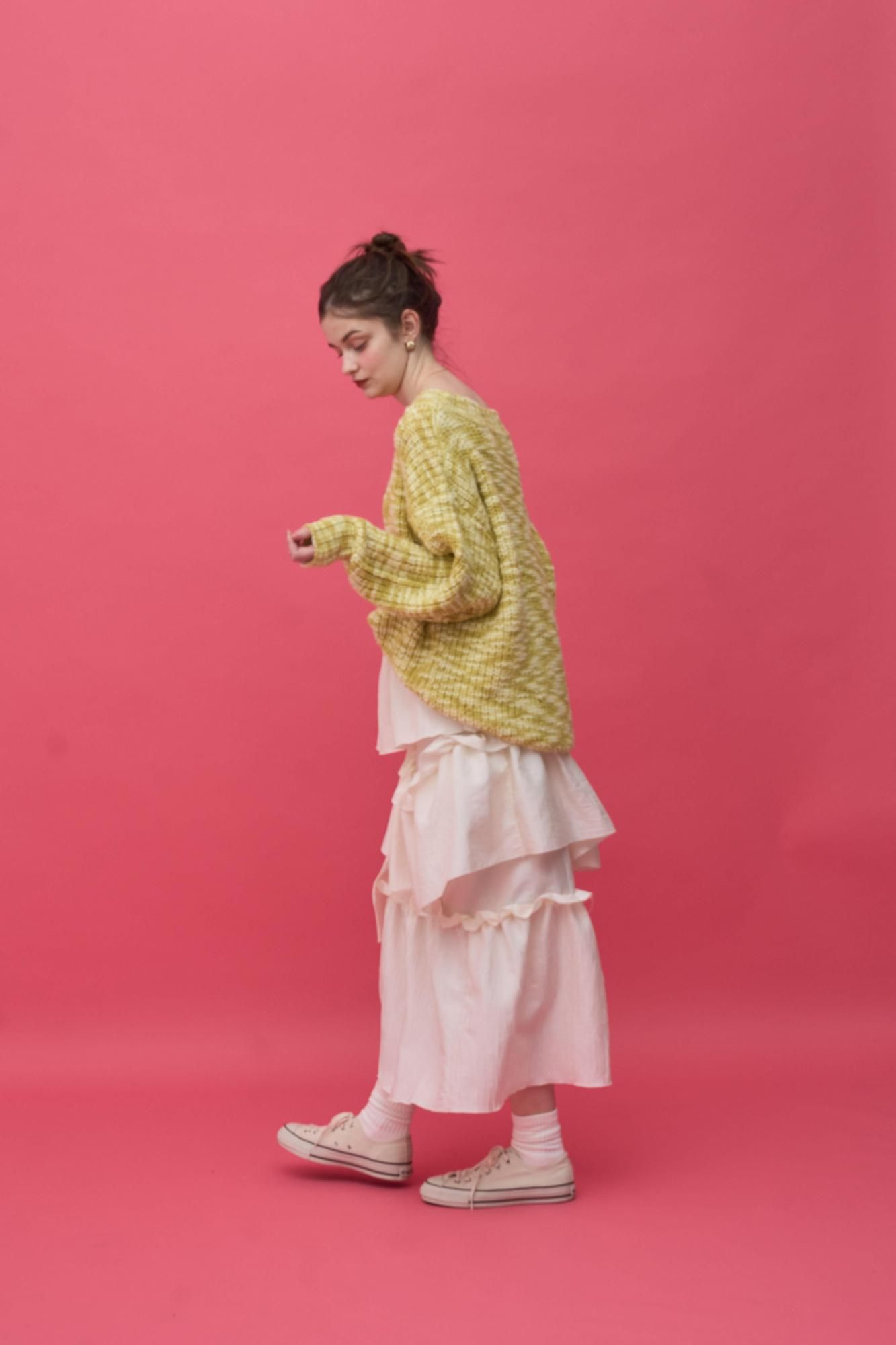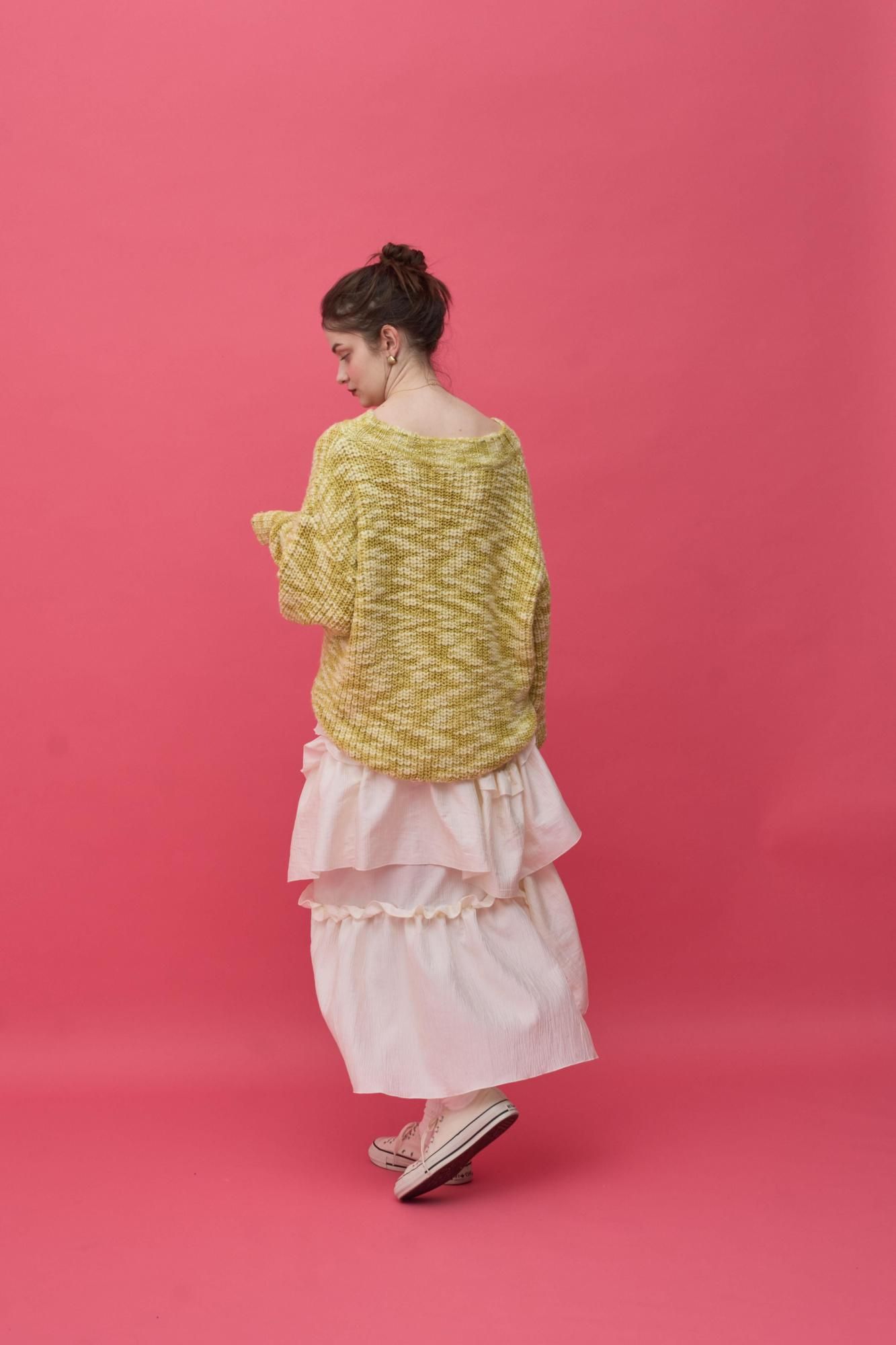 段染めのスラブヤーンで編み立てた、凹凸と色の混ざり具合がかわいいニットトップス。