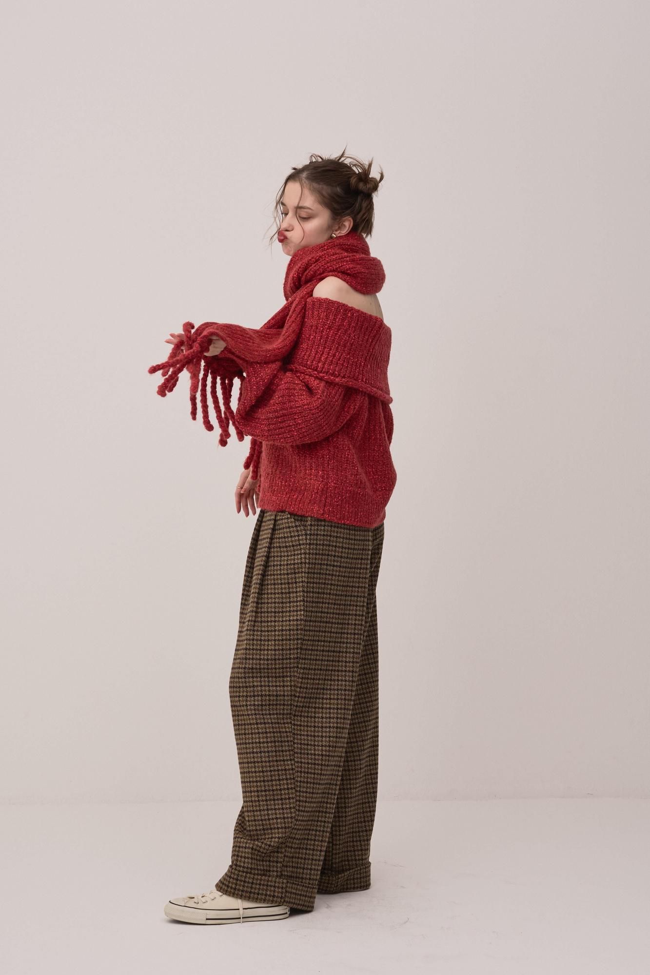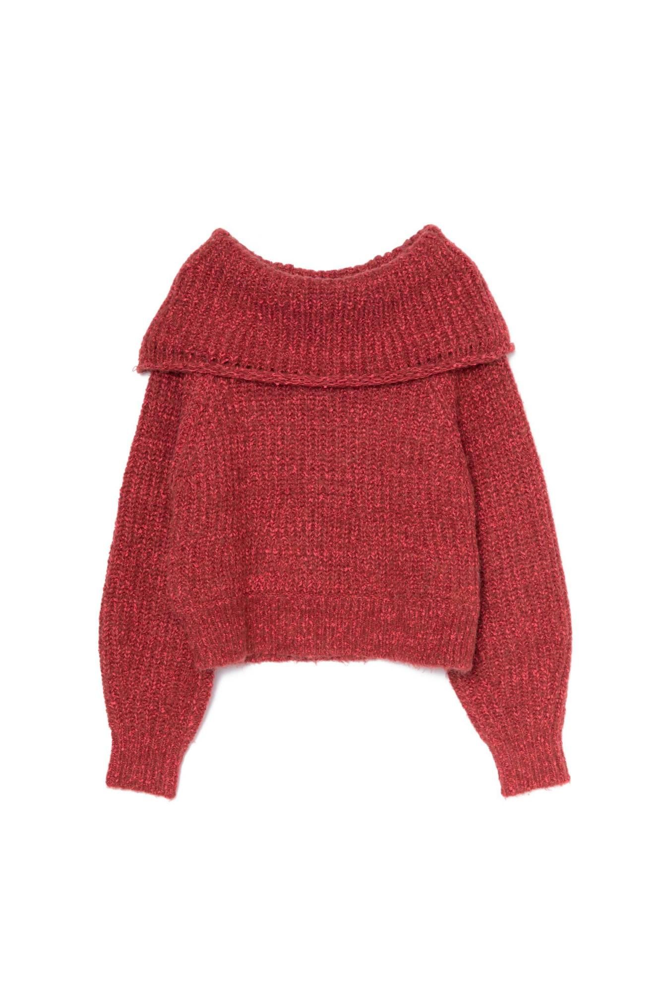ボリューミーなニットとオフショルの肌見せバランスがかわいい1枚です。