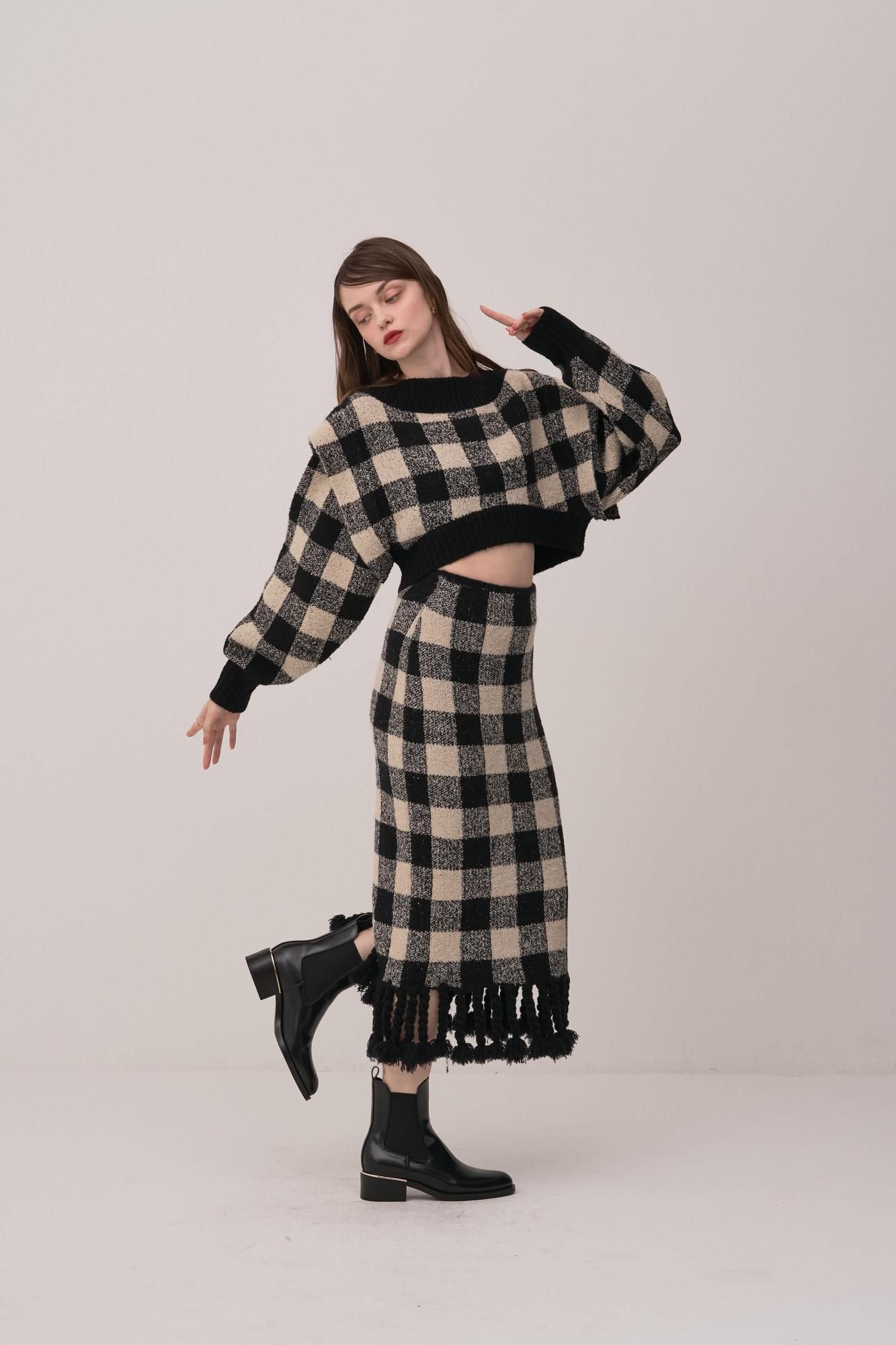 ループヤーンをチェック柄に編み立てた、暖かみのある表情のニットスカート。裾のフリンジがアクセントになったデザインで、足元はブーツ等でボリュームを持たせたスタイリングがおすすめ。