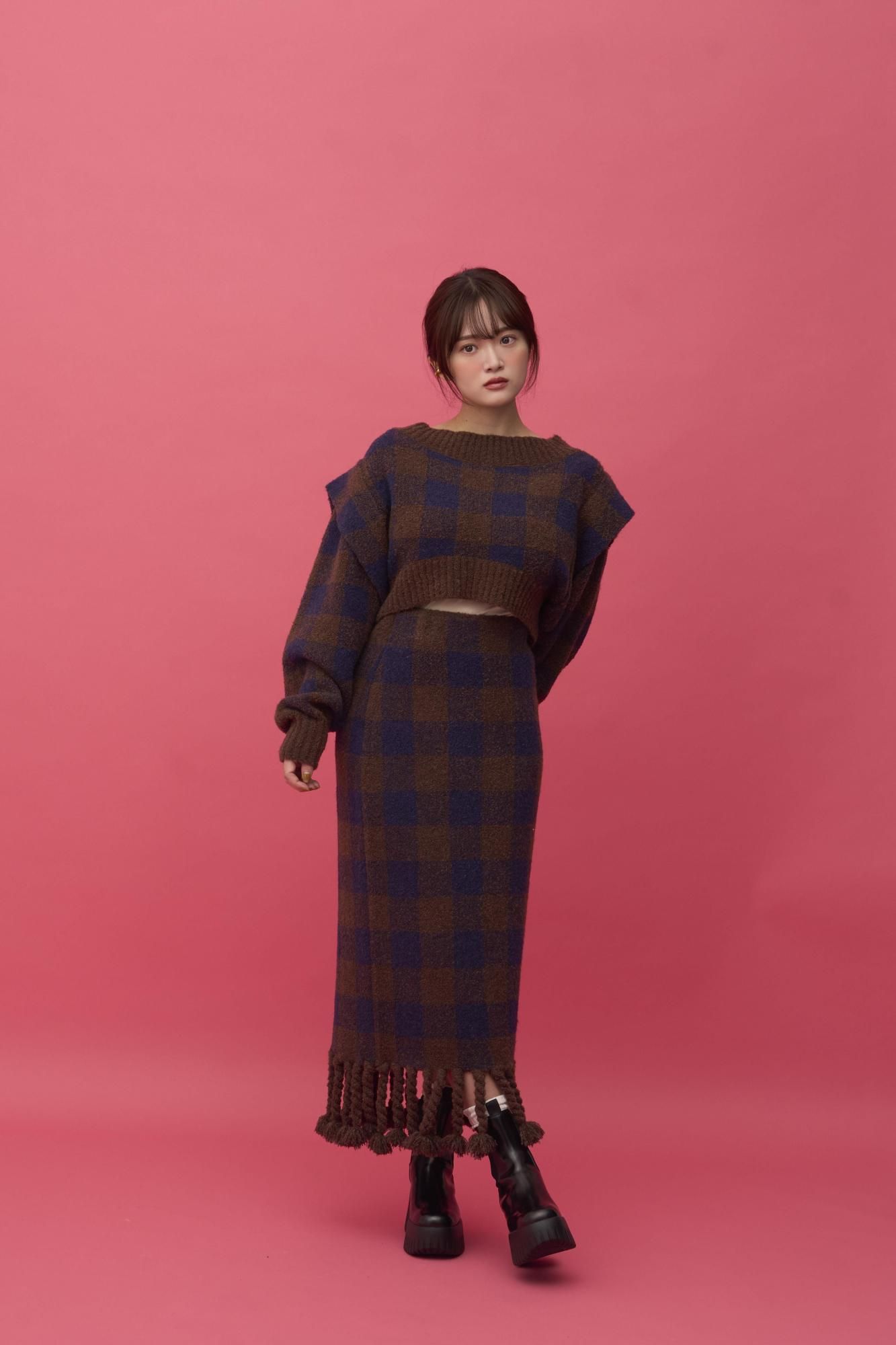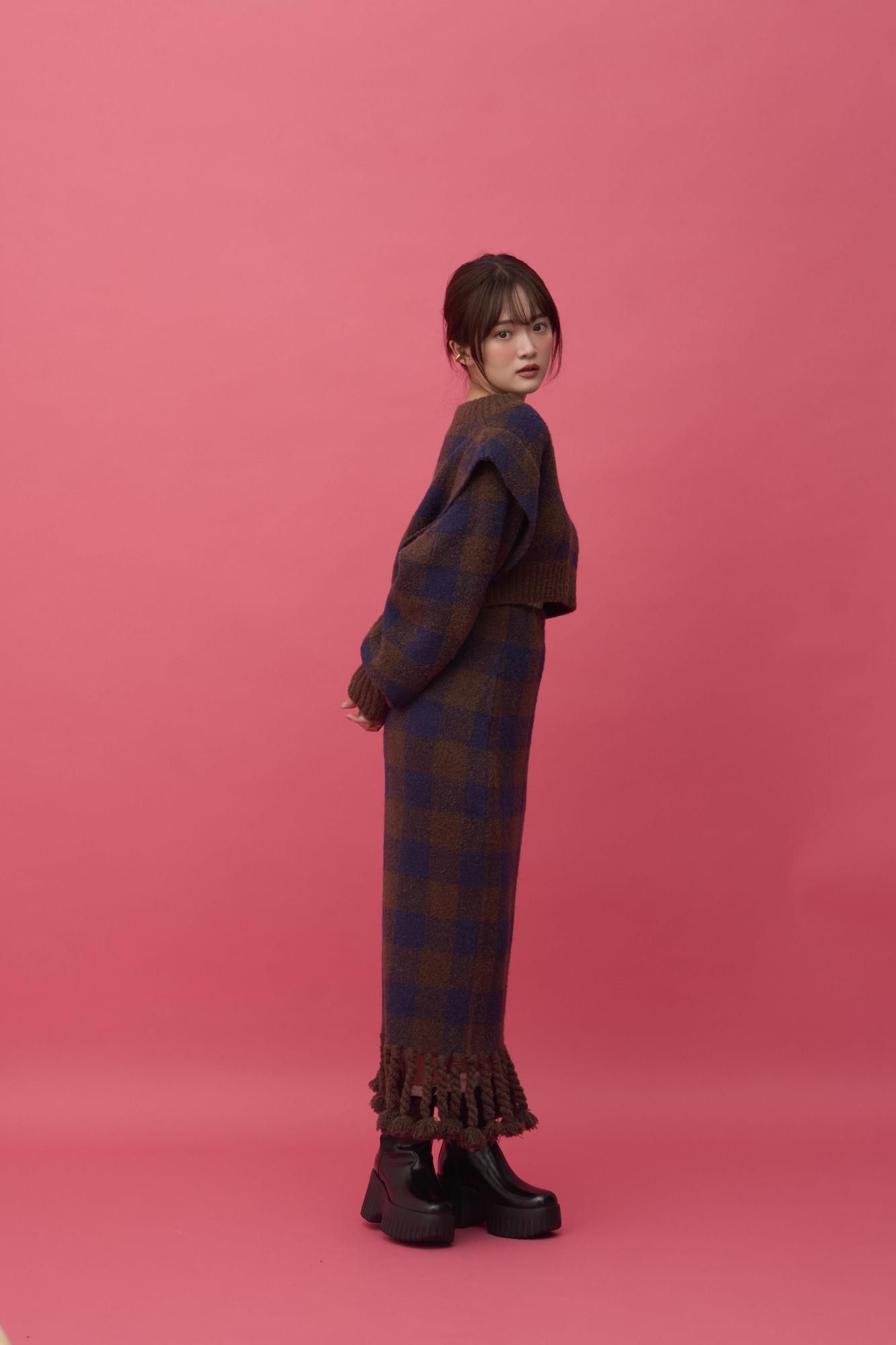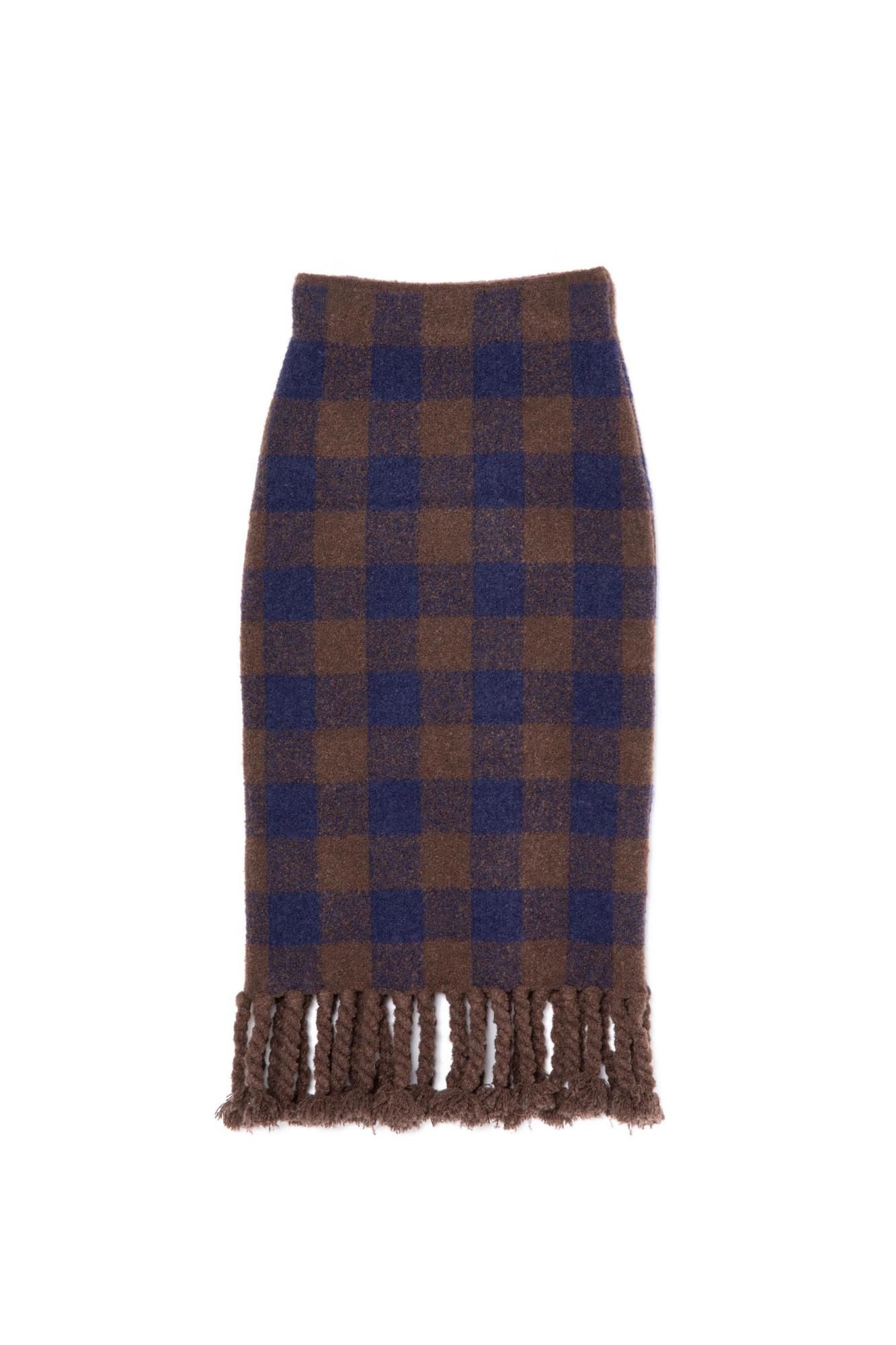 ループヤーンをチェック柄に編み立てた、暖かみのある表情のニットスカート。裾のフリンジがアクセントになったデザインで、足元はブーツ等でボリュームを持たせたスタイリングがおすすめ。