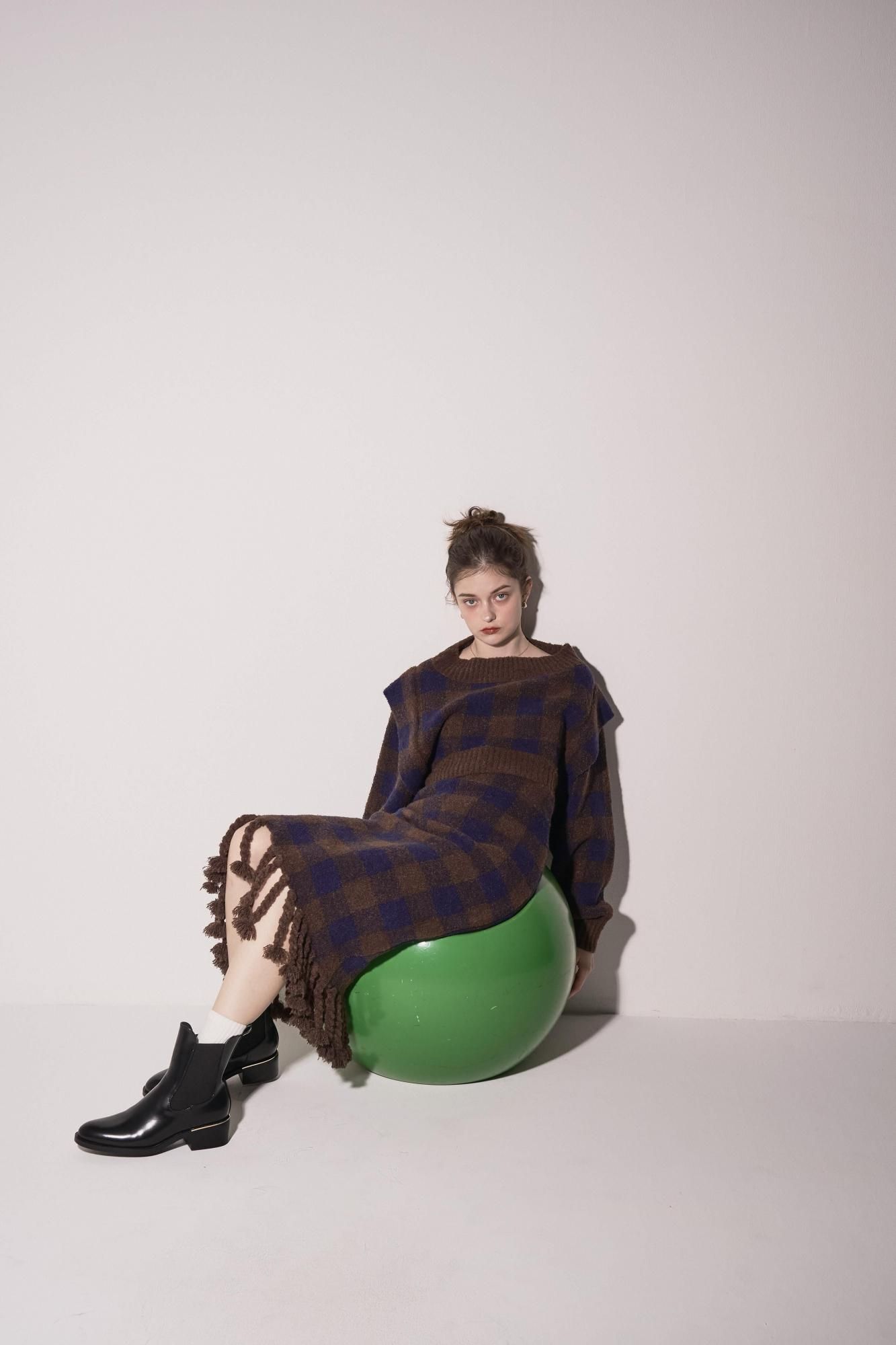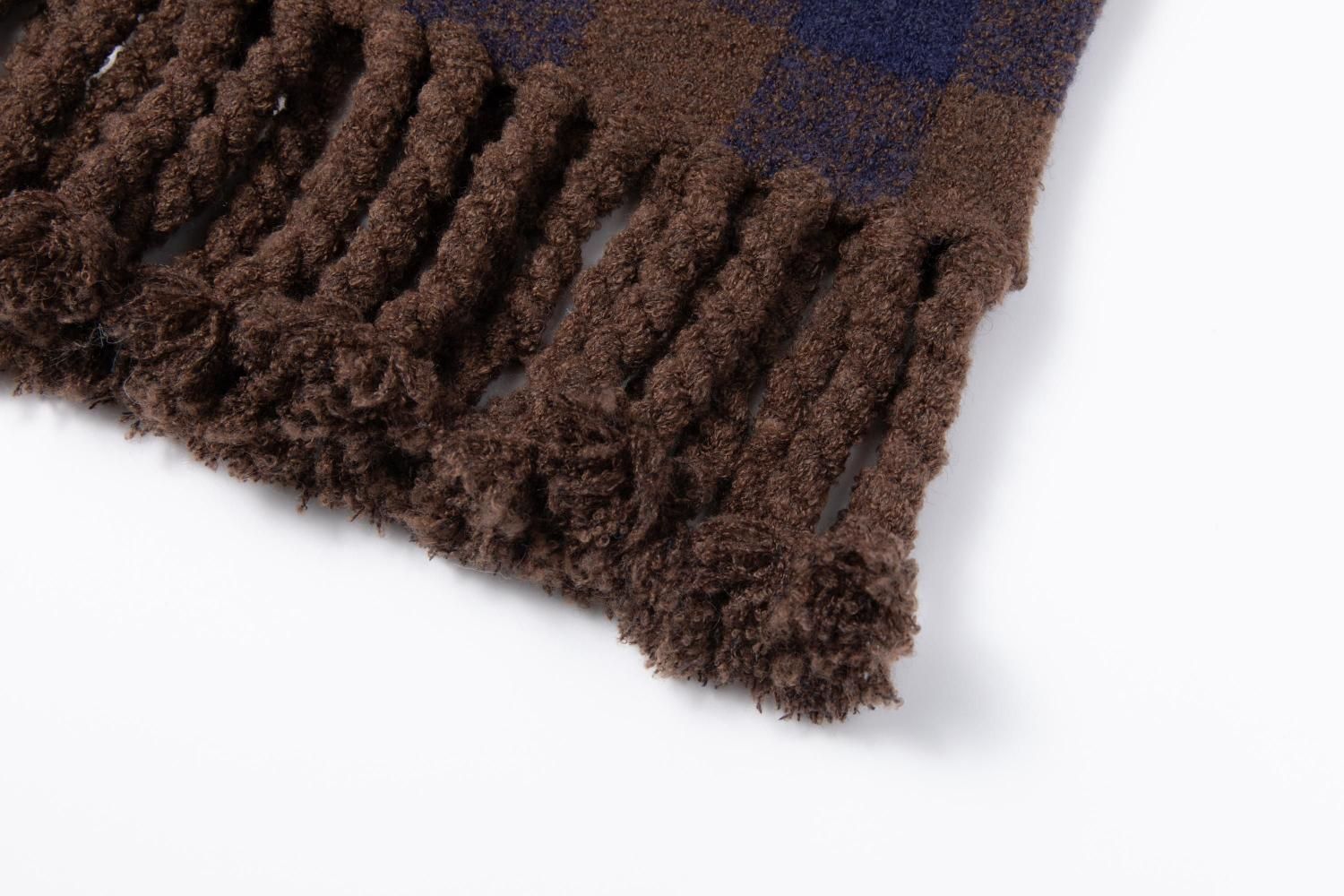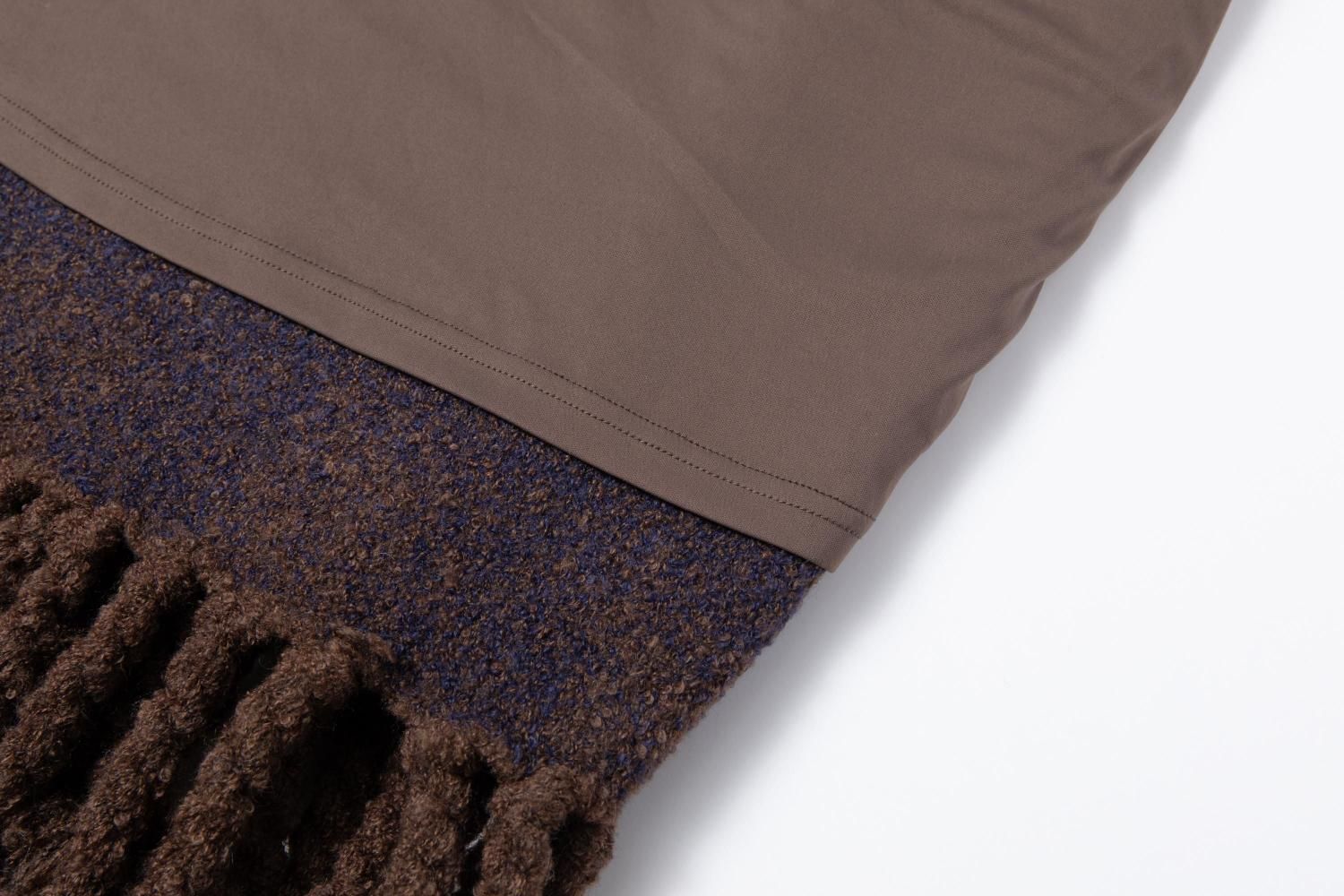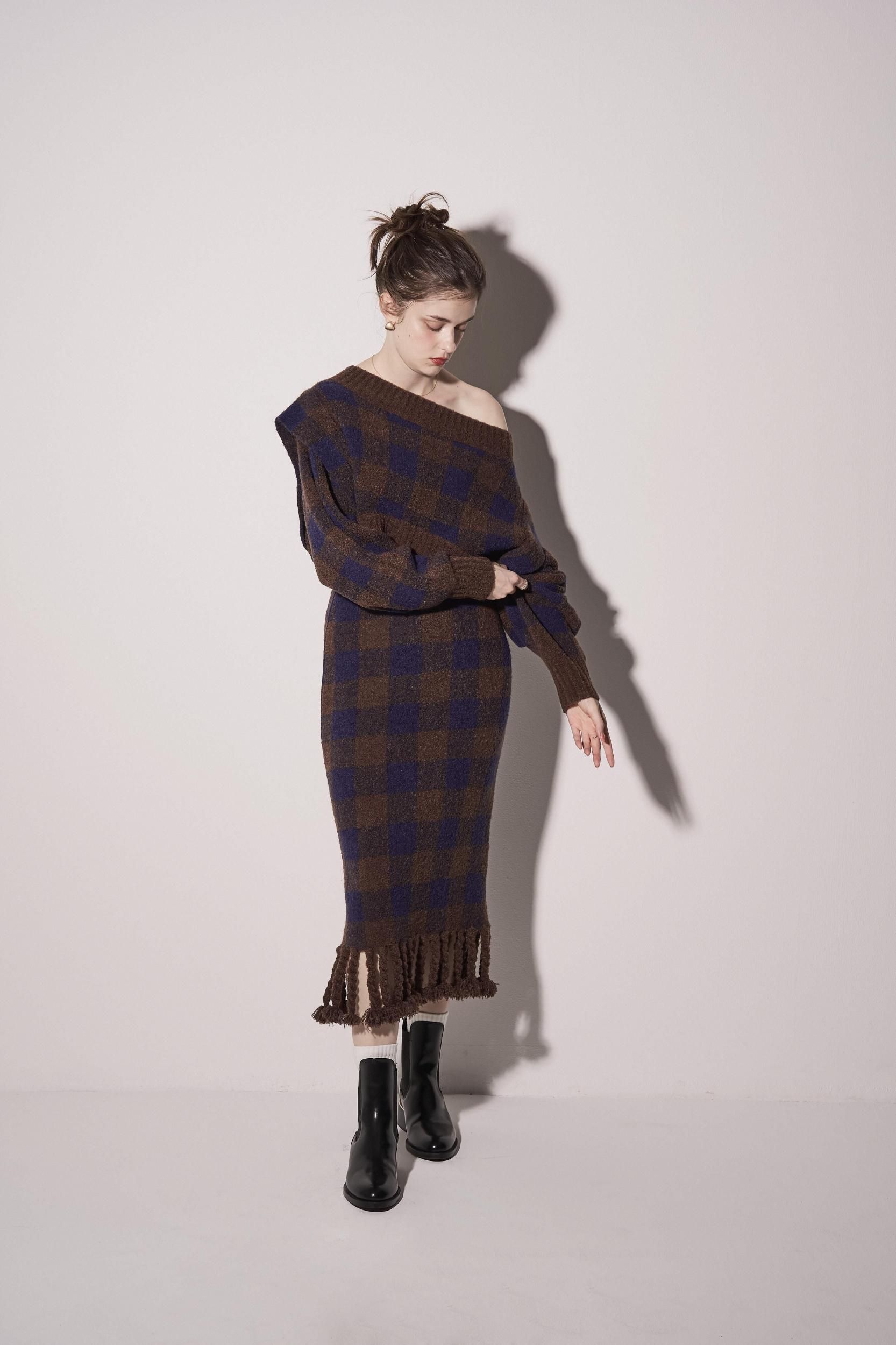 ループヤーンをチェック柄に編み立てた、暖かみのある表情のニットスカート。裾のフリンジがアクセントになったデザインで、足元はブーツ等でボリュームを持たせたスタイリングがおすすめ。