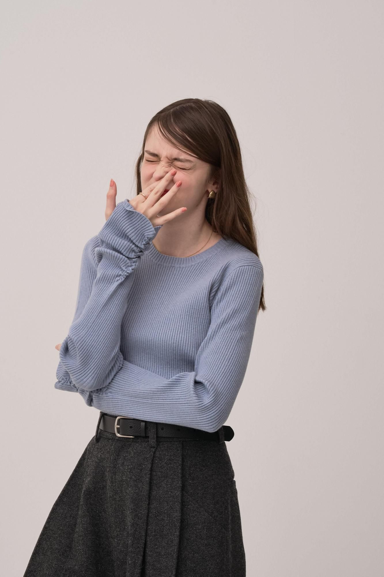 袖口にギャザーを寄せサムホールを開けたデザインで、シンプルながらも一癖あるデザインのニットトップス。